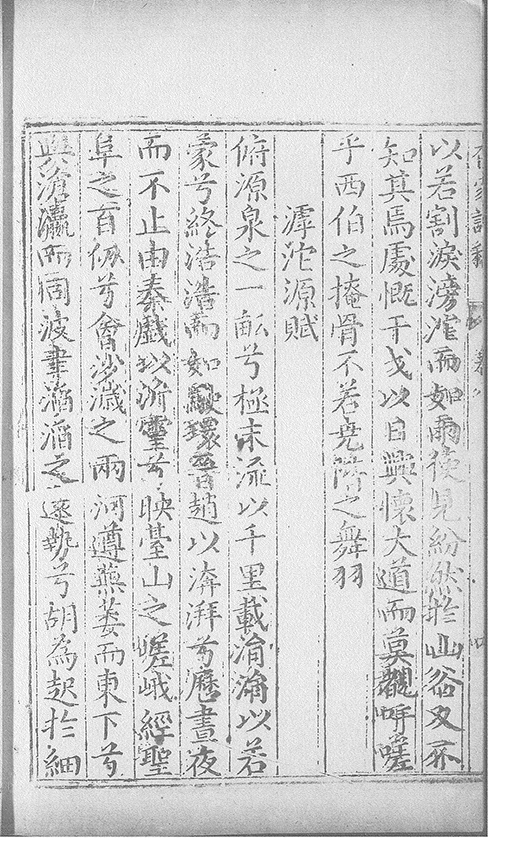 俯源泉之一畆兮極末流以千里載涓涓以若䝉兮終浩浩而如駛環晉趙以渀湃兮厯晝夜而不止由秦戯以泝靈兮映䑓山之嵯峩經聖阜之百仭兮㑹沙濊之兩河遵蕪萎而東下兮與滄瀛而同波聿滔滔之逺勢兮胡為𧺫扵細