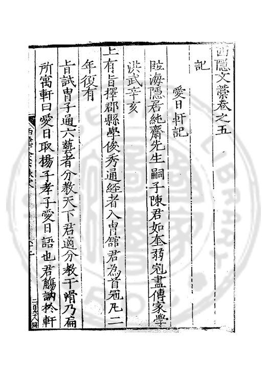 高皇帝時名藉藉在諸大夫口實與宋景濂王子充葷相羽翼二先生集今昭昭乎揭日月而行天矣乃先生獨泯沒布傳後死之謂何願命工壽諸梓敢乞一言以志不朽不佞受而卒業喟然嘆曰夫夫也非展猷布采犁然當國家寔用者乎是何文采芝鉅麗也玳瑁翡翠可以餙觀不可以禦体梗楠杞梓可以建