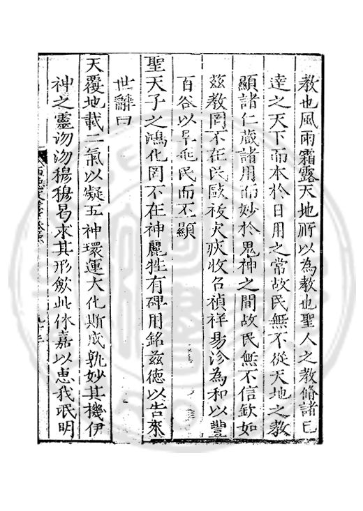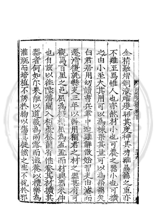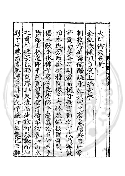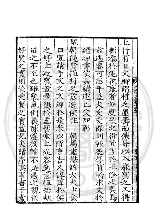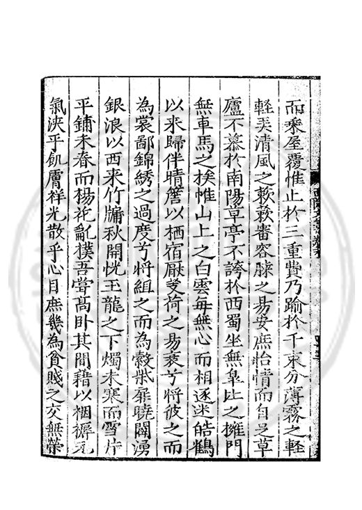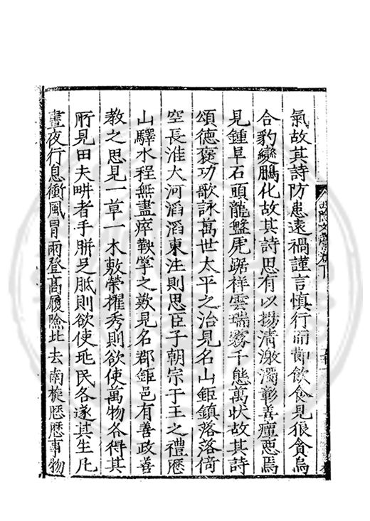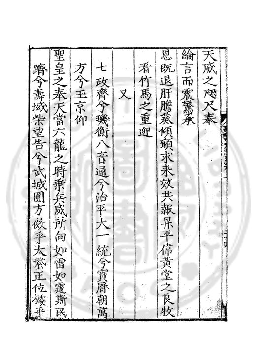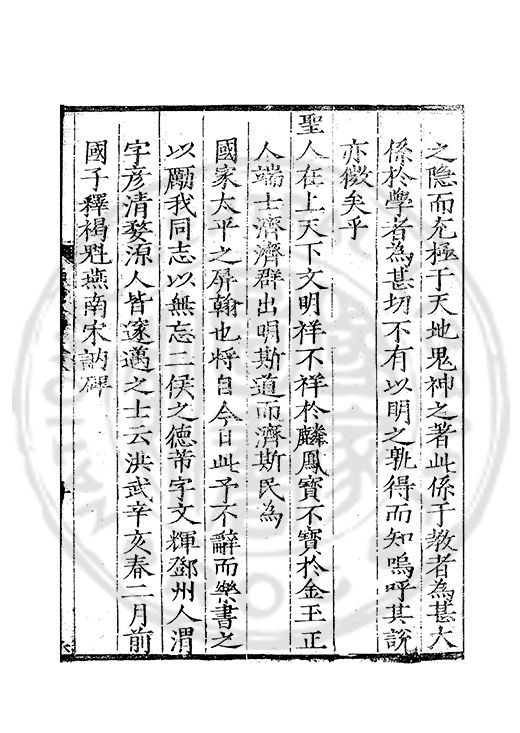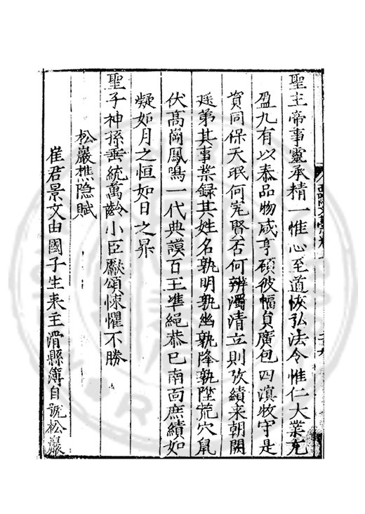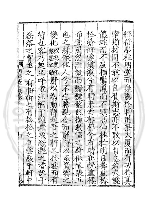 揚于羣蟄應昌眀于王國範埏埴于蒸髦赫赫焞焞烈烈訇訇誠所謂經國之大業不朽之盛事者乎寄之無瑕而昭之无極豈不偉哉盖鈞廣英咸糺縵輝媚固非靡靡下里爭耀爝光爾也冠緌佩璲之中而有甘石摯野者出必能象而書之聆而冩之用輝煌于道化振響于身名豈曰小補之哉豈曰小補之哉