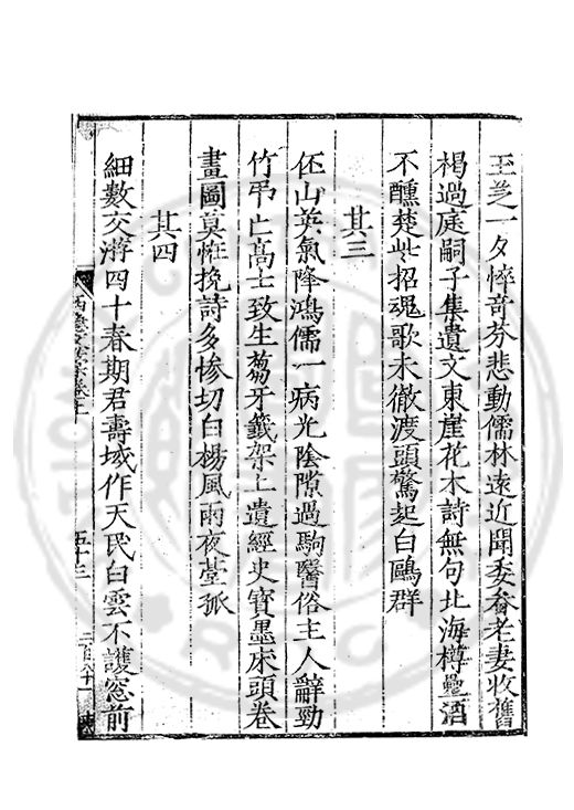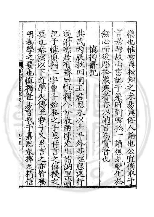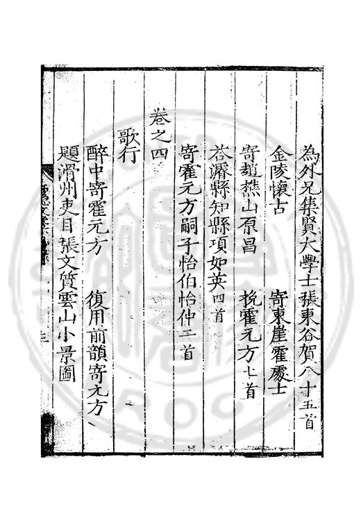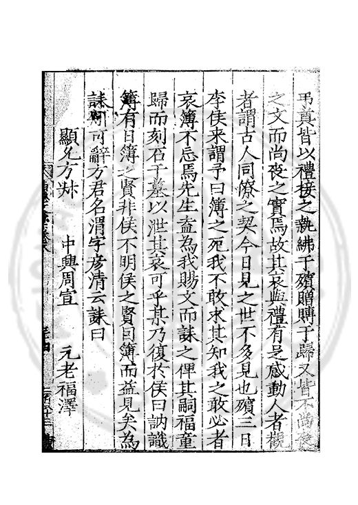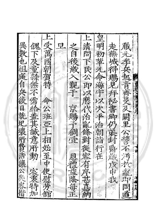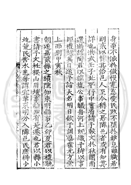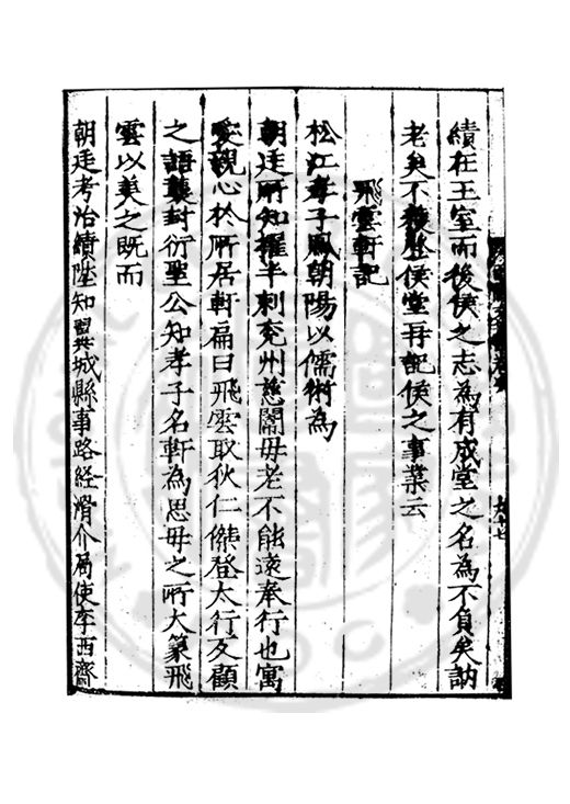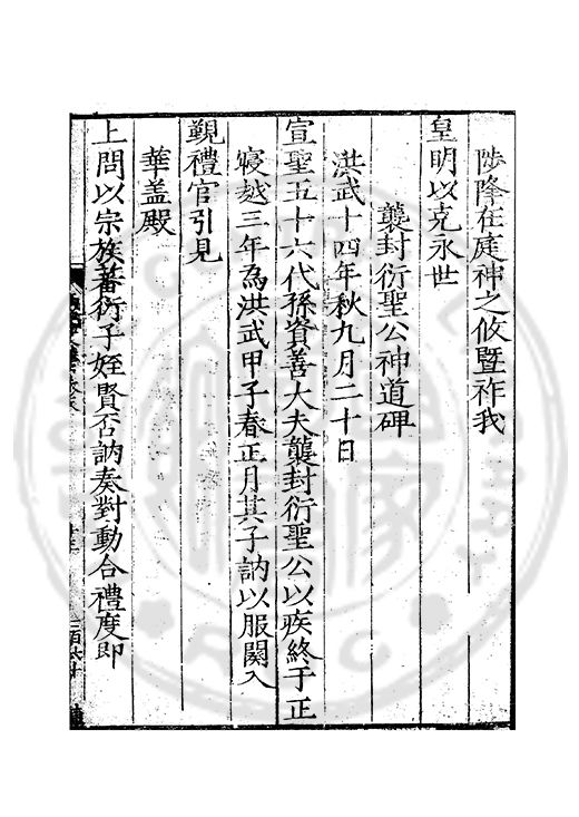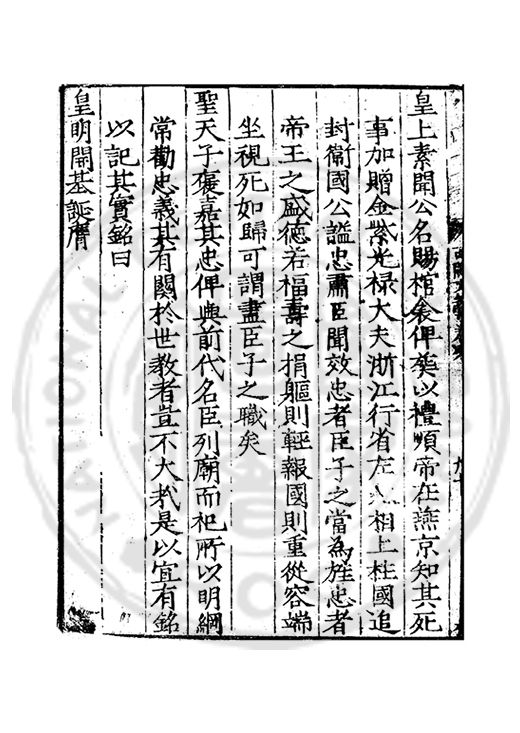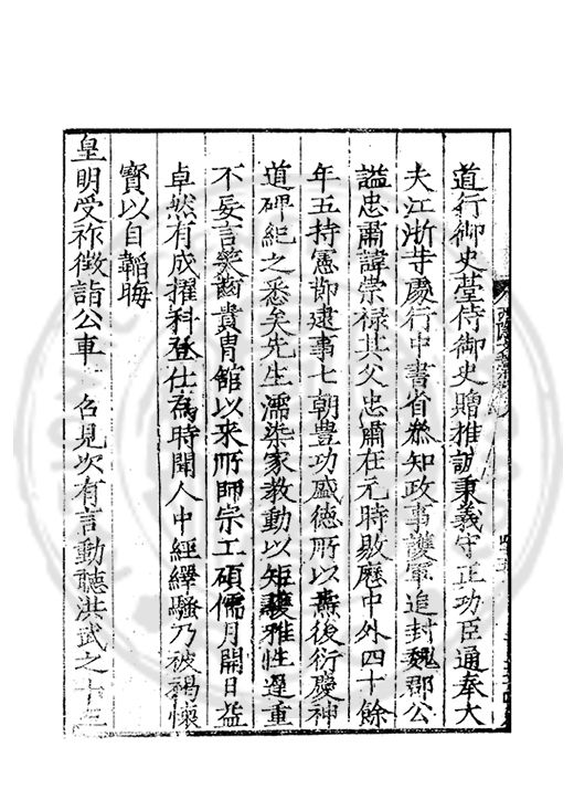 道行御史臺侍御史贈推誠秉義守正功臣通奉大夫江浙等處行中書省叅知政事護軍追封魏郡公謚忠肅諱崇祿其父忠肅在元時揚歷中外四十餘年五持憲節逮事七朝豐功盛徳所以燾後衍慶神道碑紀之悉矣先生濡染家教動以矩獲雅性遲重不妄言笑齒貴胄館以來所師宗工碩儒月開日益卓然有成擢科登仕為時聞人中經繹騷乃被褐懷寳以自韜晦