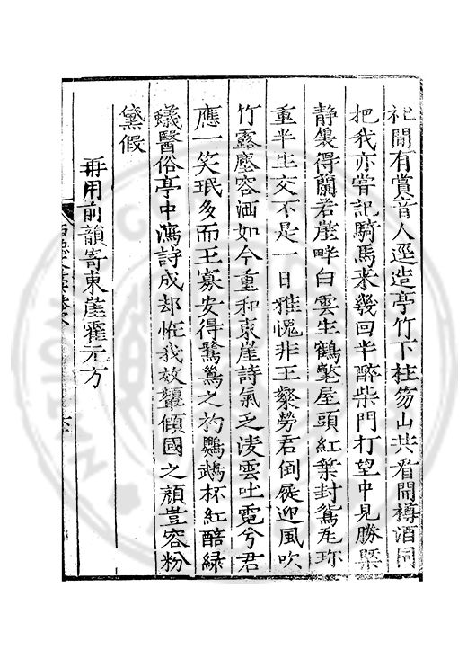 則山人所樂在白雲茅屋之中心倦而休意行所在或採芝術或尋蘭佩橫遮谷口疑蒸雨後之晴嵐濃抹山椒驚失曉來之翠黛到窮處而水源可探看起時而詩情與會此則山人所樂在白雲茅屋之外方其未葺是雲屋也盛年科第故家文獻出宰百里郎星朗現心融潘岳之春花滿河陽之縣喜招隱之賦成諧遂初之始願及其既葺是雲屋也養浩林泉放情丘壑結社漁樵訂盟𤠔鶴已甘分於退休諒何心於好爵胡束帛之見征違夙昔之素約乃登