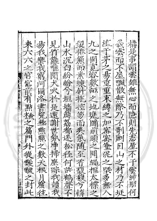 構是事謂雲雖無心而隱則先志屋不于雲締剙何義云而不屋飄散無際乃不剞劂因山之材乃不埏埴于茅之易重重束縛之加密密塗泥之塈多無八九之間寛容數畝之地甕牖前頭之開繩樞太樸之制卷簾而素練斜拖拄笏而爽氣隨至香馥馥兮博山水沈白紛紛兮垣墻薜茘都迷松徑何許鶴聲不見竹籬唯聞犬吠於是遠謝世氛淨掃塵蹤我讀我易我樂我窮河圖洛書究極點點之數天根月窟往來六六之宮窓前有點檢之篇門外従靉靆之封此