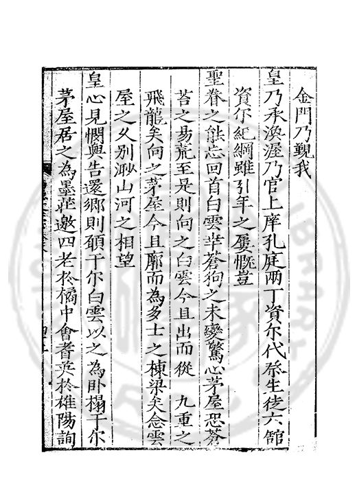 聖眷之能忘回首白雲幸蒼狗之未變驚心茅屋恐蒼苔之易荒至是則向之白雲今且出而從 九重之飛龍矣向之茅屋今且廓而為多士之棟梁矣念雲屋之久別渺山河之相望