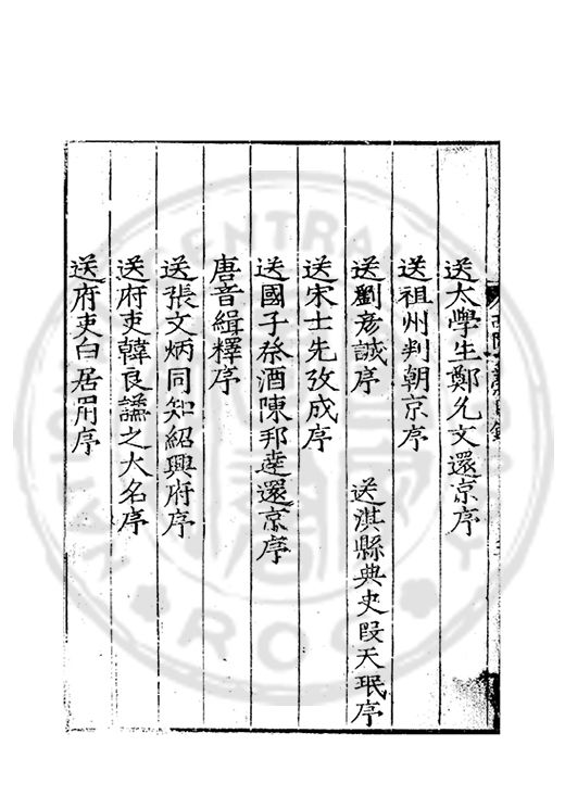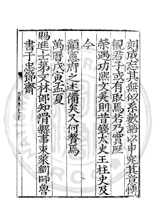 予儋析滑符蒞止越禩民喻予衷而予得間于民聴也乃徃據獻哲考羅舊章則祭酒西隠宋先生其彰彰較著者也爰諏其家藏得一筴焉予睇之盖載輯于上海張君趨教滑時所手錄而滑先達王先生崇之令上海從其後得之正諸學士錢先生序而刻于其邑者也滑