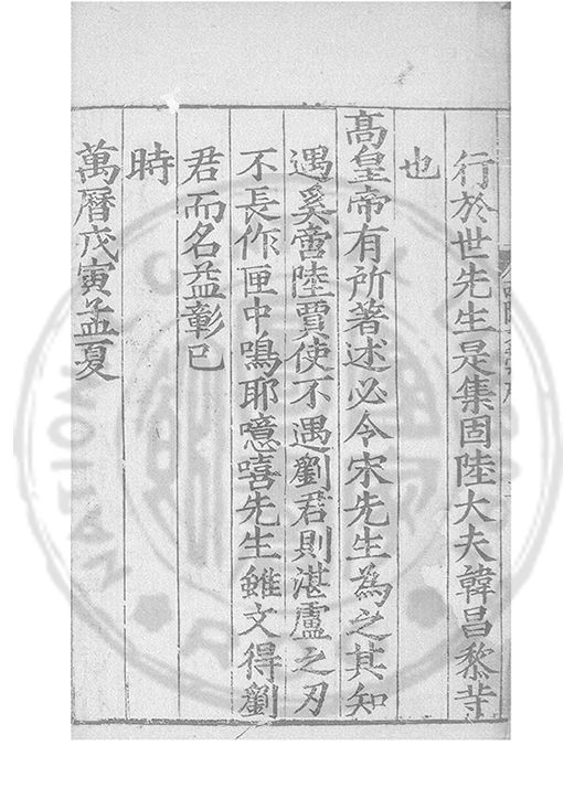 屋不可以眩俗文章事業盖無之難矣先生事業具在國史中余不具論迺其屬辭□文視古作者何媿豈古之所稱難者先生頑易之與抑有王者興則必有名世蟋蟀蜉蝣固不偶偶爾也昔漢高以馬上得天下陸賈徃說以詩書帝大恱名其書曰新語至今傳之韓昌黎以文章起八代之衰得歐陽公而始大