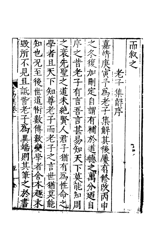 嘉靖庚寅予為老子集解其後屢有修改丙申之冬復加刪定自謂有補於道德之萬分廼自序之昔老子有言吾言甚易知天下莫能知周之衰先聖之道未絶賢人君子猶有為性命之學者且天下知尊老子而老子之言世猶莫能知也况至後世道術數傳數變學者舍本趣末毁所不見且詆訾老子為異端則其筆之於書