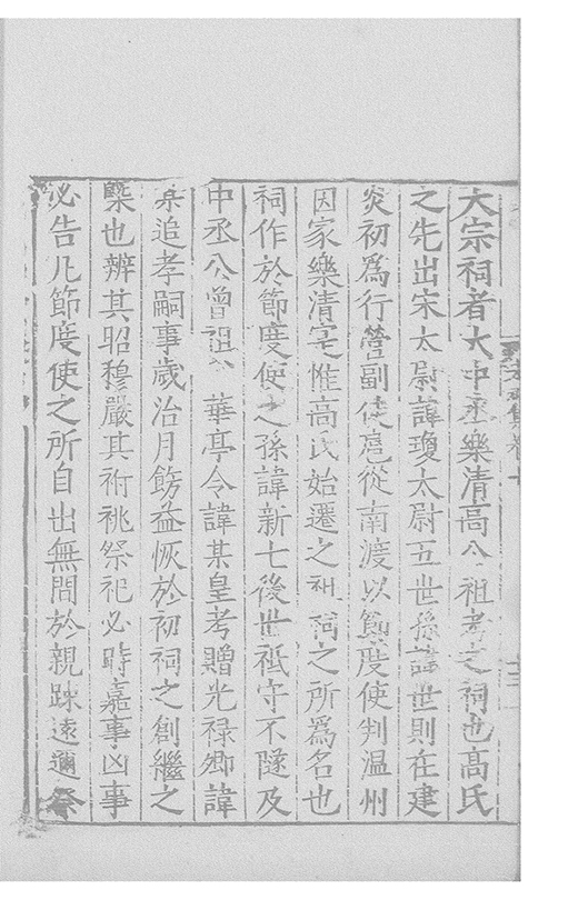 大宗祠者大中丞樂清高□祖考之祠也高氏之先出宋太尉諱瓊太尉五世孫諱世則在建炎初為行營副使扈從南渡以節度使判温州因家樂清寔惟高氏始遷之祖祠之所為名也祠作於節度使之孫諱新七後世祇守不隧及中丞公曽祖□華亭令諱某皇考贈光禄卿諱□追孝嗣事歲治月飭益恢於初祠之創繼之槩也辨其昭穆嚴其祔祧祭祀必時嘉事凶事必告凡節度使之所自出無間於親踈逺邇祭