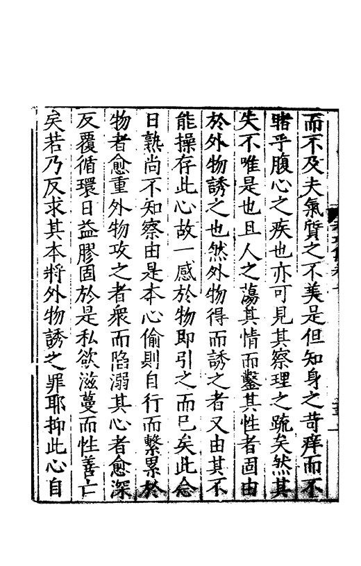 而不及夫氣質之不美是但知身之苛痒而不睹乎腹心之疾也亦可見其察理之疏矣然其失不唯是也且人之蕩其情而鑿其性者固由於外物誘之也然外物得而誘之者又由其不能操存此心故一感於物即引之而巳矣此念日熟尚不知察由是本心偷則自行而繋累於物者愈重外物攻之者衆而陷溺其心者愈深反覆循環日益膠固於是私欲滋蔓而性善亡矣若乃反求其本將外物誘之罪耶抑此心自