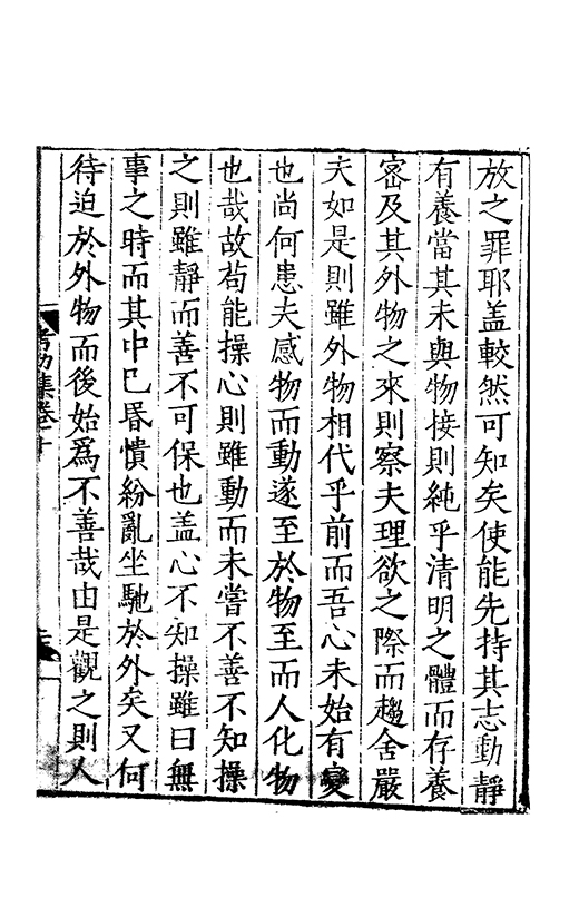 放之罪耶盖較然可知矣使能先持其志動靜有養當其未與物接則純乎清明之體而存養宻及其外物之來則察夫理欲之際而趨舍嚴夫如是則雖外物相代乎前而吾心未始有變也尚何患夫感物而動遂至於物至而人化物也哉故茍能操心則雖動而未嘗不善不知操之則雖靜而善不可保也盖心不知操雖曰無事之時而其中已昬憒紛亂坐馳於外矣又何待迫於外物而後始為不善哉由是觀之則人