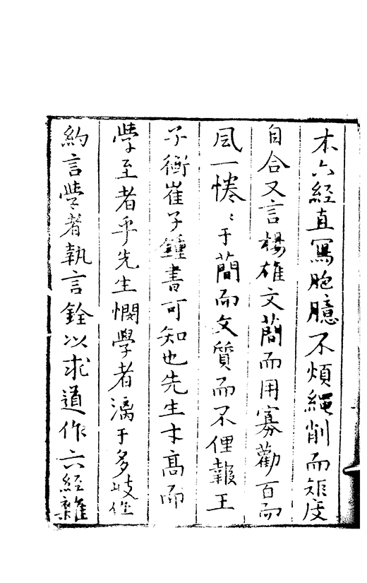 木六經直寫胞臆不煩繩削而矩度自合又言楊雄文簡而用寡勸百而風一惓惓于簡而文質而不俚報王子衡崔子鍾書可知也先生才高而學至者乎先生憫學者漓于多歧作約言學者執言銓以求道作六經雜