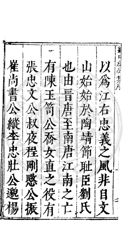 以為江右忠義之風非自文山始始於陶靖節耻臣劉氏也由晉唐至南唐江南之亡有陳玉笥公喬女直之役有張忠文公叔夜程剛愍公振崔尚書公縱李忠壯公邈楊