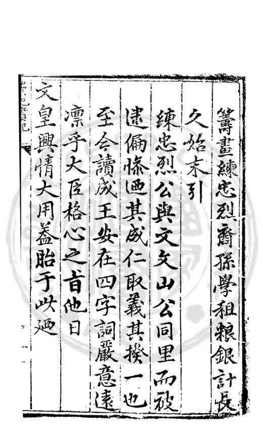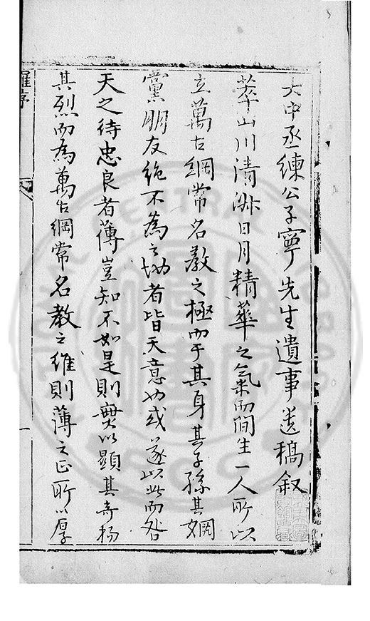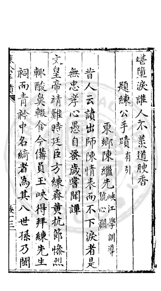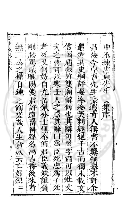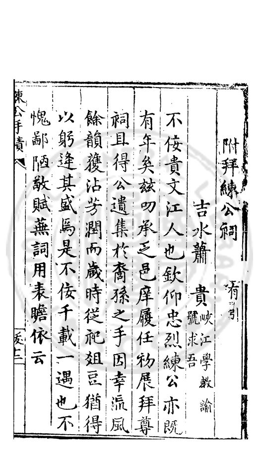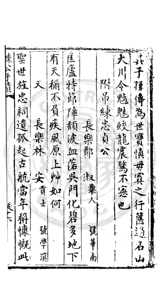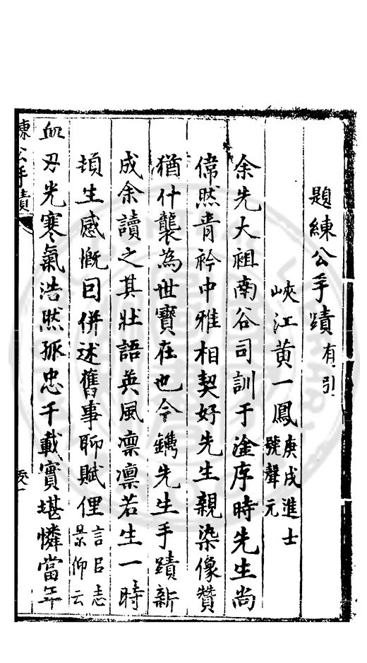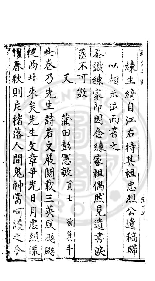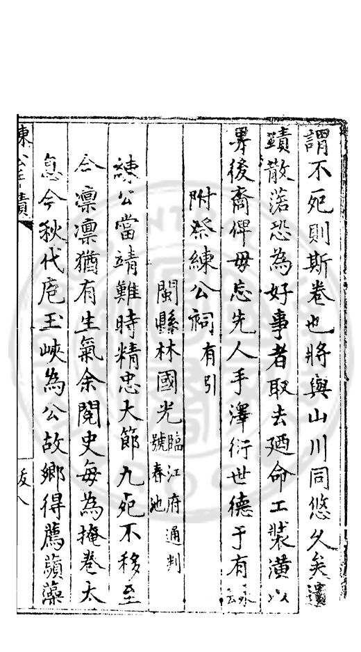 螺□公曰讀練中丞之文者不必搜□犁之賦□□龍之句惟獨成工安在四字而練公之文莫大乎是□□從來贊先生者未捐到此自郭公拈出而先生之生□□開千萬載不朽□若先生者真能殺自成仁舍生取□真能讀孔孟之書上可□兩聖賢在天之靈而無愧夏可對夷齊諸忠烈之英而不忤者也誇曰高山仰止景行行止雖不能至然心嚮往之□故授古以明先生浩氣勁骨超越前人者萬萬我