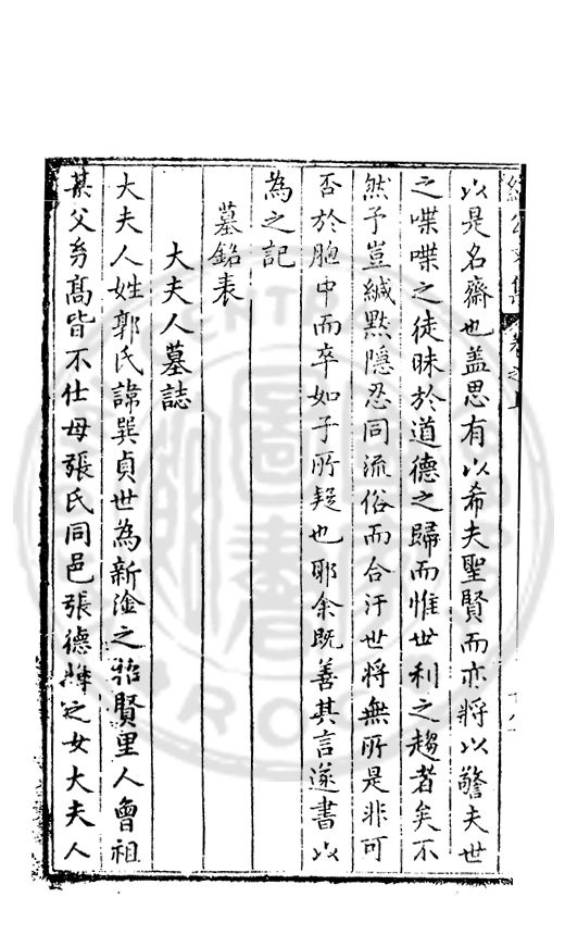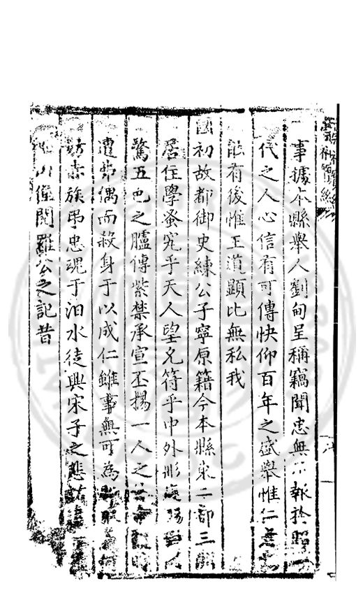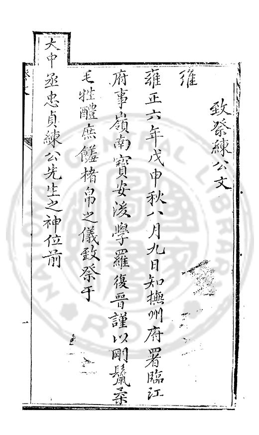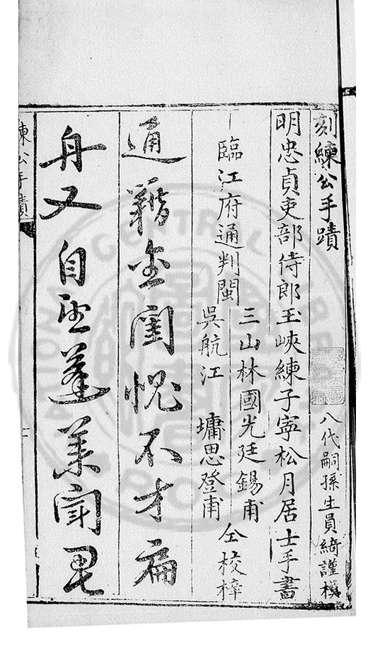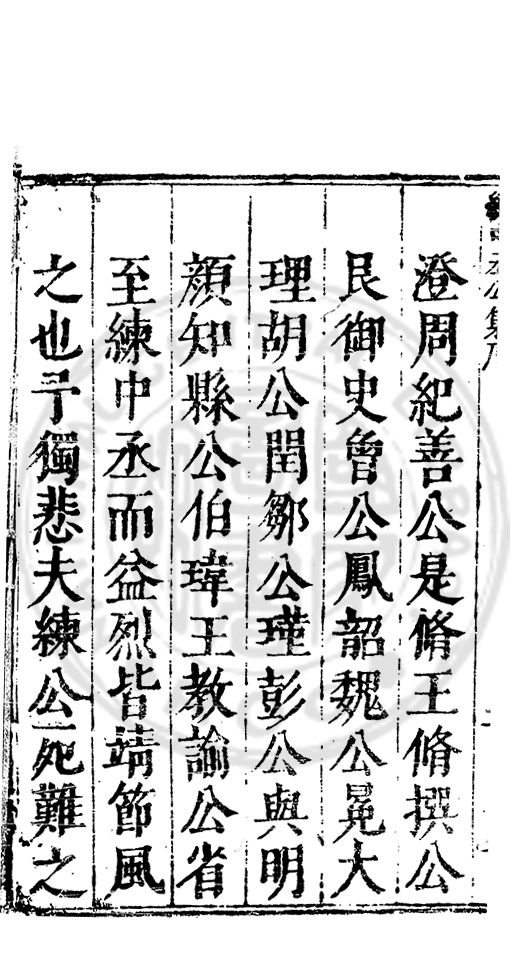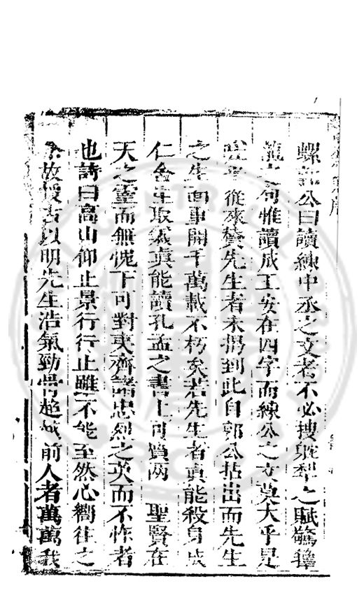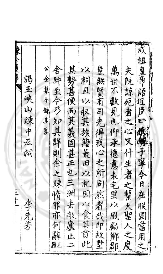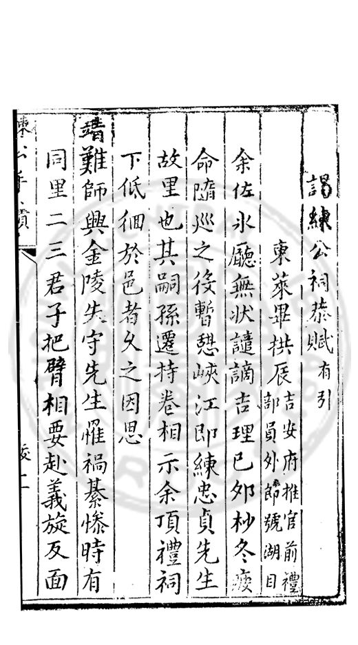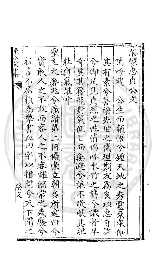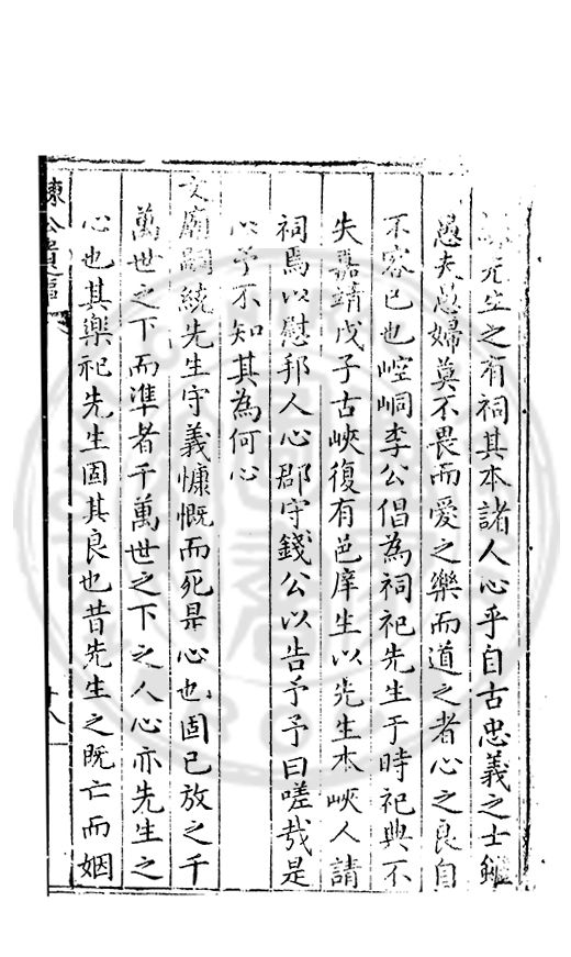 螺□公曰讀練中丞之文者不必搜□犁之賦□□龍之句惟獨成工安在四字而練公之文莫大乎是□□從來贊先生者未捐到此自郭公拈出而先生之生□□開千萬載不朽□若先生者真能殺自成仁舍生取□真能讀孔孟之書上可□兩聖賢在天之靈而無愧夏可對夷齊諸忠烈之英而不忤者也誇曰高山仰止景行行止雖不能至然心嚮往之□故授古以明先生浩氣勁骨超越前人者萬萬我