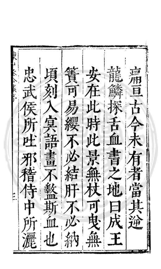 龍鱗探舌血書之地曰成王安在此時此景無杖可曳無簀可易纓不必結肝不必納頃刻入冥語畫不□斯血也中武侯所吐邪稽侍中所灑