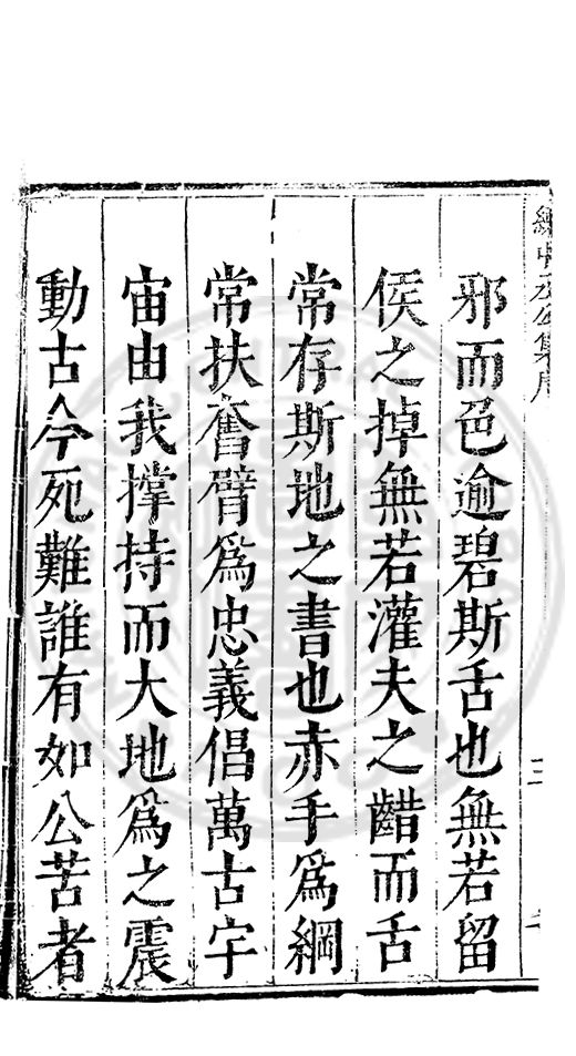 邪而色逾碧斯舌也無若留侯之掉無若灌夫之齰而舌常存斯地之書也赤手為綱常扶奮臂為忠義倡萬古宇宙由我撑持而大地為之震動古今死難誰有如公苦者