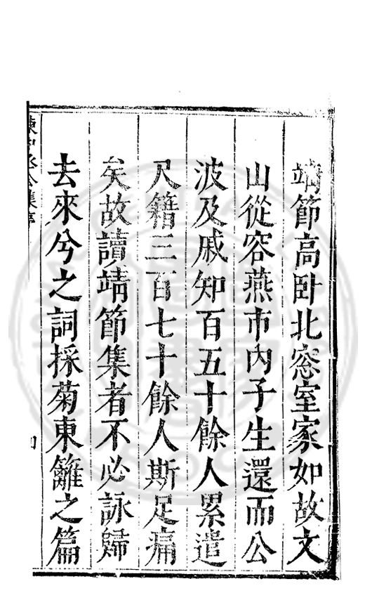 靖節高臥北窓室家如故文山從容燕市內子生還而公波及戚知百五十餘人累遣尺籍三百七十餘人斯足痛矣故讀靖難集者不必詠歸去來兮之詞採菊東籬之篇