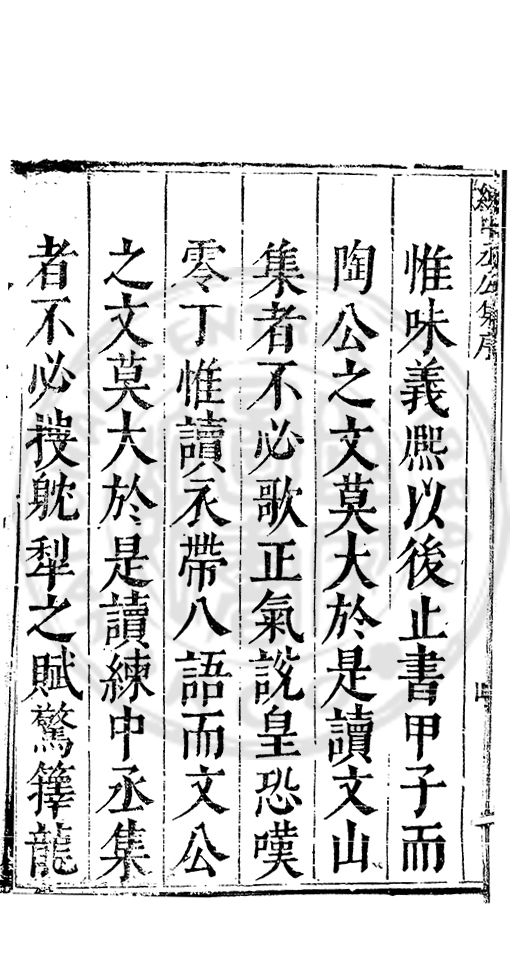 惟味義熙以後止書甲子而陶公之文莫大於是讀文山集者不必歌正氣說皇恐嘆零丁惟讀衣帶八語而文公之文莫大於是讀練中丞集者不必搜耽犁之賦驚籜龍