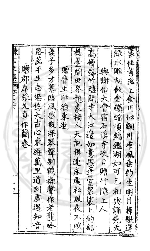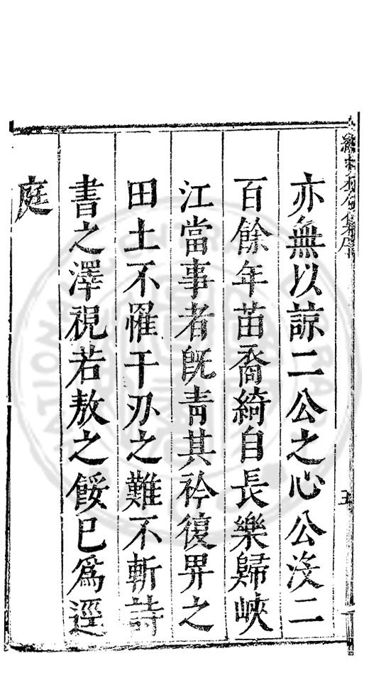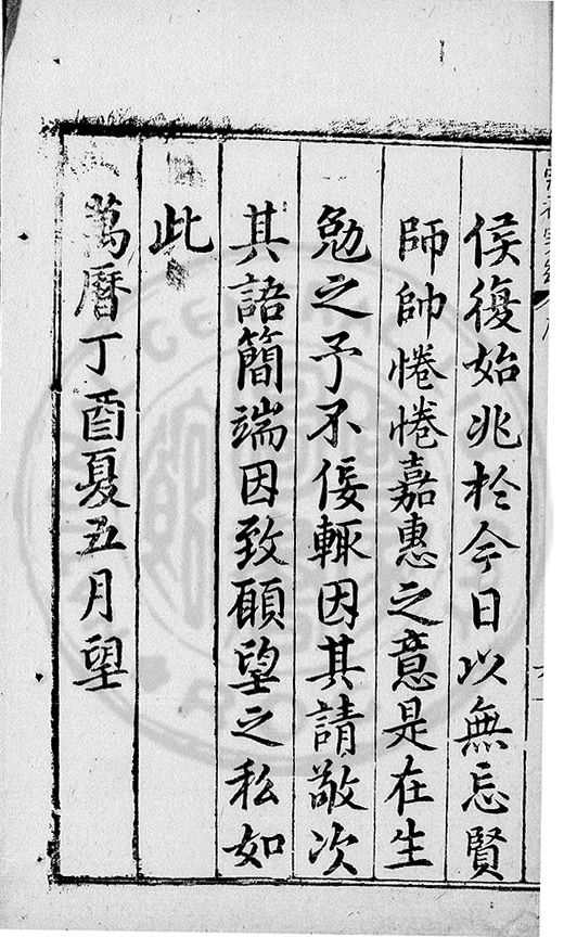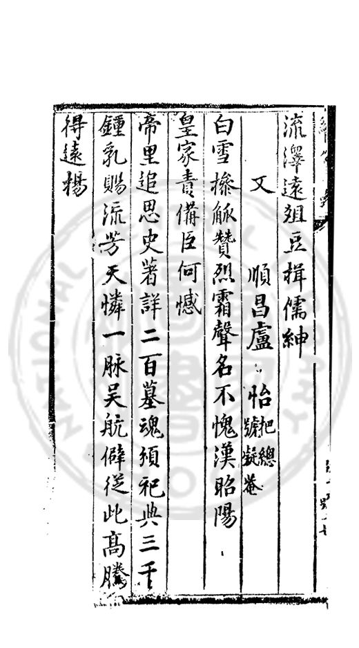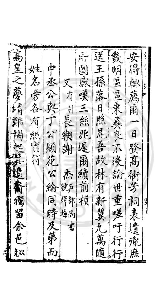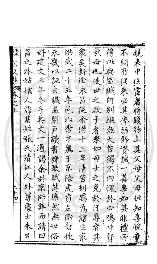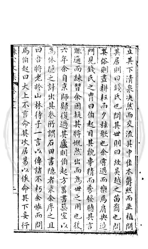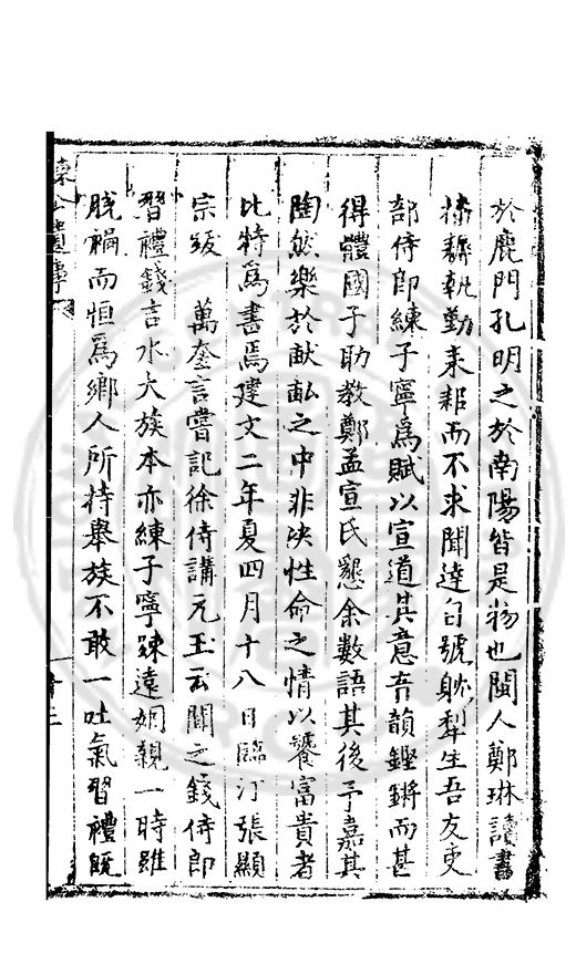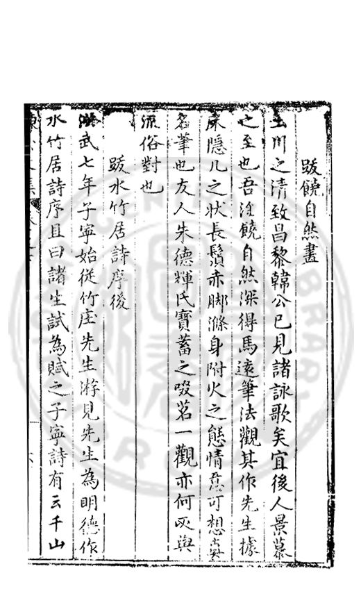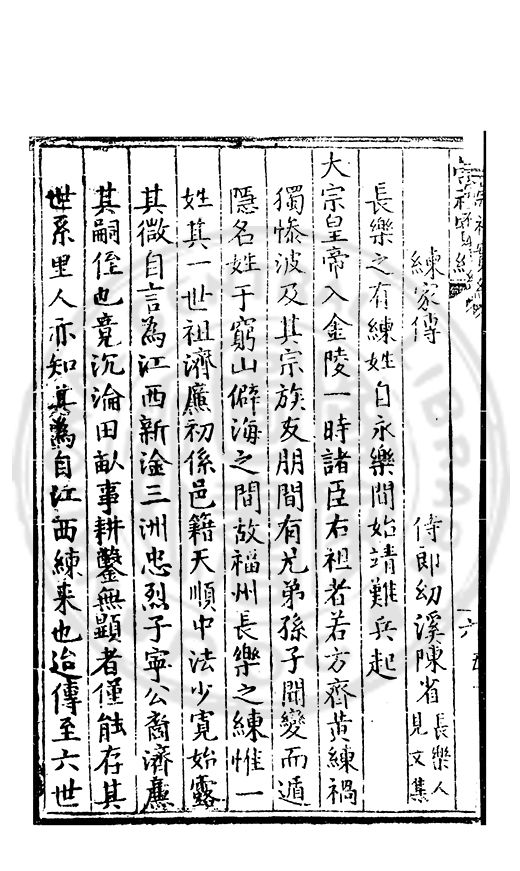 於鹿門孔明之於南陽皆是物也閩人鄭琳讀書播耨執勤耒耜而不求聞達自號躭犂生吾友吏部侍郎練子寧為賦以宣道其意音韻鏗鏘而甚得體國子助教鄭孟宣氏懇余數語其後予嘉其陶然樂於畎畝之中非決性命之情以饕富貴者比特為書焉建文二年夏四月十八日臨汀張顯宗跋 萬奎言嘗記徐侍講元玉云聞之錢侍郎習禮錢吉水大族本亦練子寧踈遠姻親一時雖脫禍而恆為鄉人所持舉族不敢一吐氣習禮既