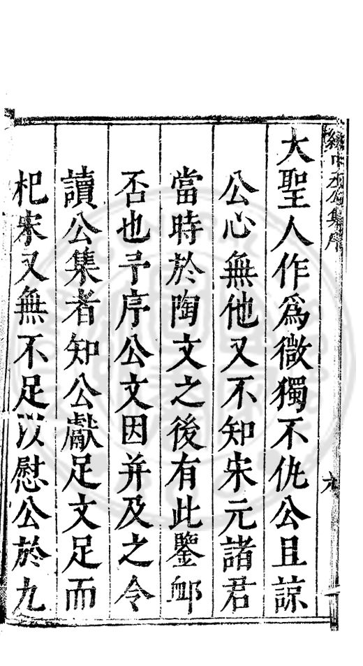 大聖人作為微獨不仇公且諒公心無他又不知宋元諸君當時於陶文之後有此鑒卹否也予序公文因并及之令讀公集者知公獻足文足而杞宋又無不足以慰公於九