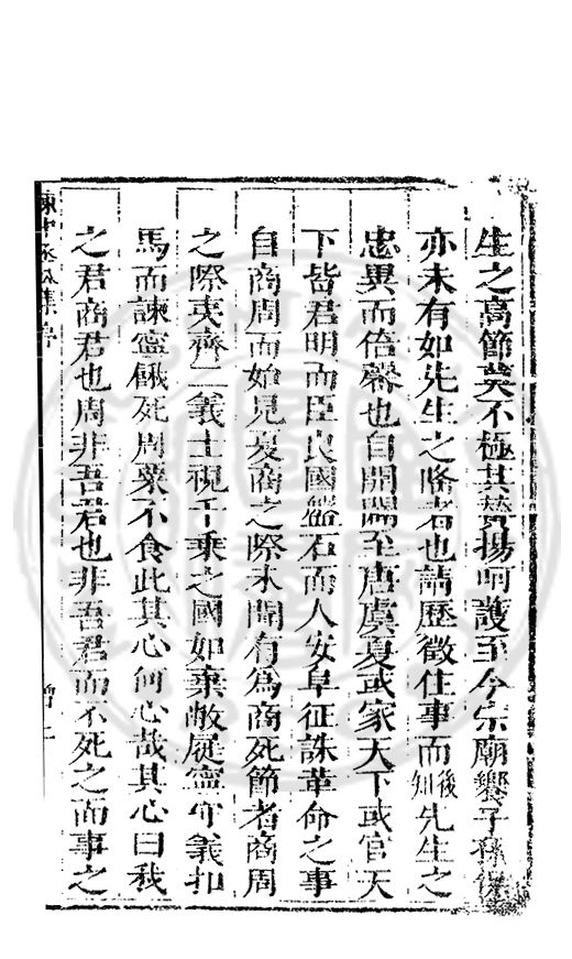 生之高節莫不極其□揚呵護至今宗廟饗子孫□亦未有如先生之降者也請歷徵往事而後知先生之忠異而倍馨也自開關至唐虞夏或家天下或官天下皆君明而臣良國盤石而人安□征誅革命之事自商周而始見夏商之際未聞有為商死節者商周之際夷齊二義士視千乘之國如棄敝履寧守義扣馬而諫寧餓死周粟不食此其心何心哉其心曰我之君商野周非吾君而不死之事之