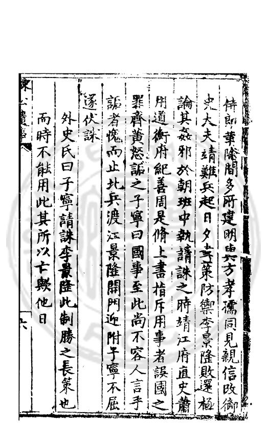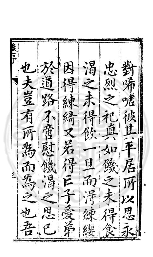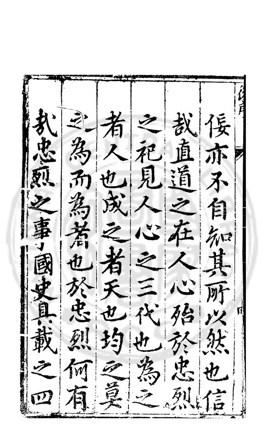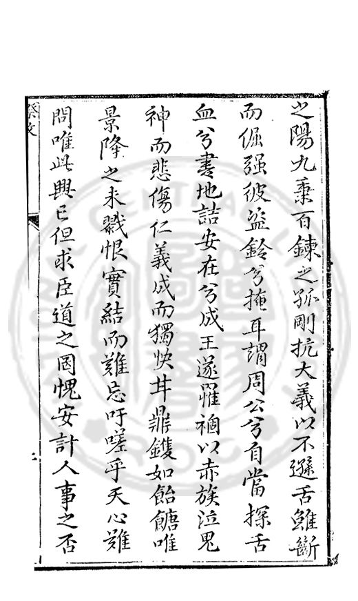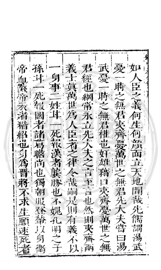 如人臣之義何生何顏面立天地間哉先儒謂湯武憂一時之無君夷憂萬世之無君先大夫嘗曰湯武憂一時之無君權也奸雄藉口夷齊優萬世之無君經也綱常永立先大夫之言至言也然則夷齊兩義士真萬世為人臣者之律令哉嗣是則有義不以一身事二姓耳一死報漢者□勝也不媿孔明之子村耳一死報國者諸葛瞻尚也獨朝服登輩以身衛帝血濺帝□□□紹也身為晉將不求生願速死者