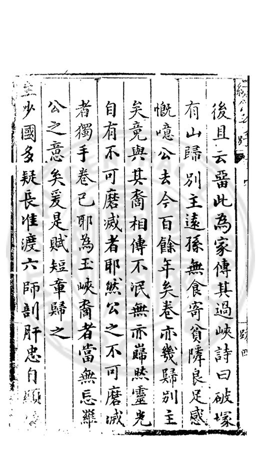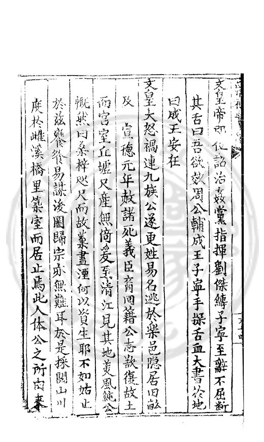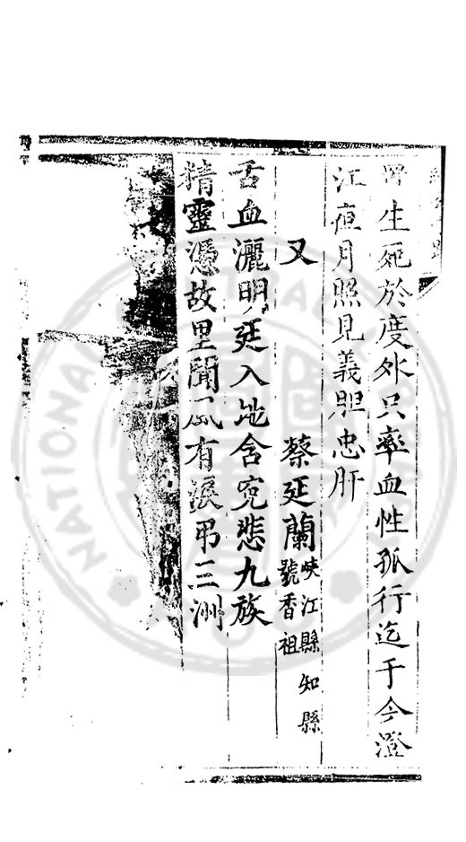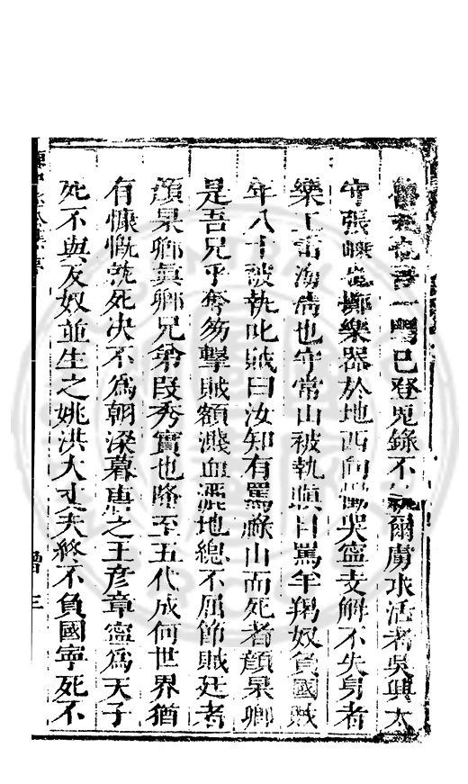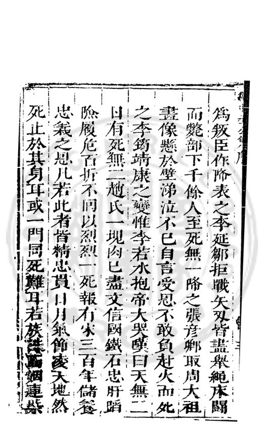 為判臣作降表之李延鄒拒戰矢刃皆盡舉繩床□而斃部下千餘人至死無一降之張彥鄉取周大祖畫像懸於壁涕泣不已自言受恩不敢負赴火而死之李筑靖康之變惟李若水抱帝大哭嘆曰天無二日有死無二趙氏一塊肉已盡交信國鐵石忠肝□險履危百折不回以烈烈一死報有宋三百年儲養忠義之恩凡若此者皆精忠貫日月氣節凌天地然死止於其身耳或一門同死難耳若族□□□□□