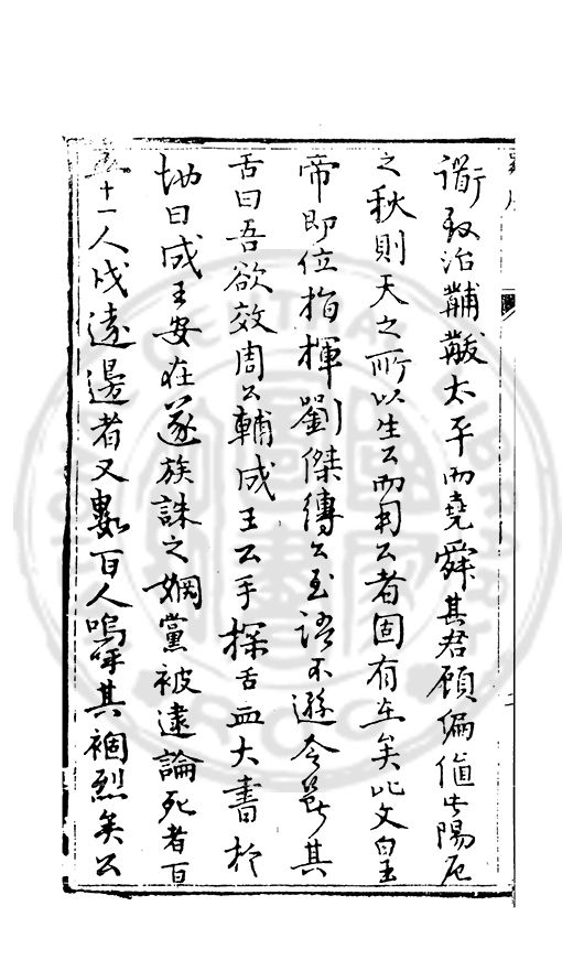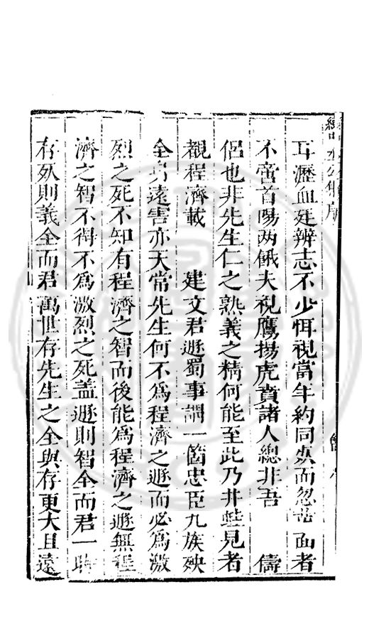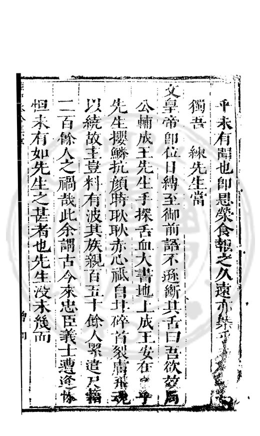 耳瀝血廷辨志不少□視當年約同□而忽□面者不啻首陽兩餓夫視鷹揚虎賁諸人總非吾□侶也非先生仁之熟義之精何能至此乃井蛙見者覩程濟載建文君□蜀事謂一□忠臣九族殃全身遠害亦天常先生何不為程濟之□而必為激烈之死不知有程濟之智而後能為程濟之□無程濟之智不得不為激烈之死盖□則智全而君一時存死則義全而君萬世存先生之全與存更大且遠