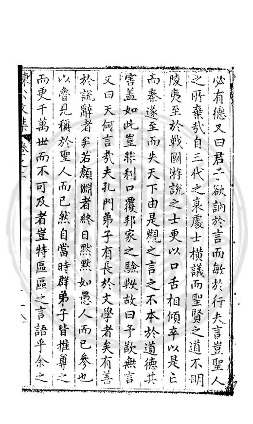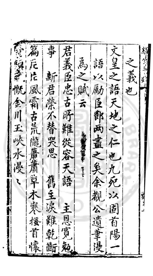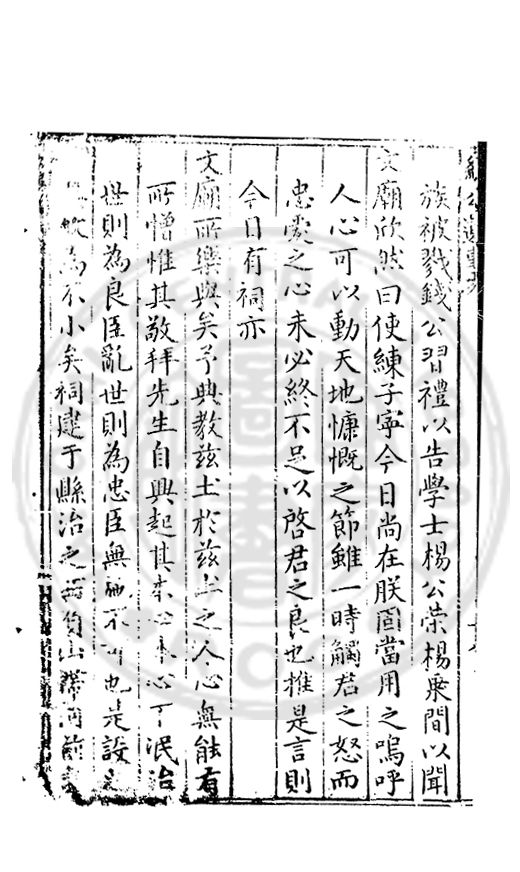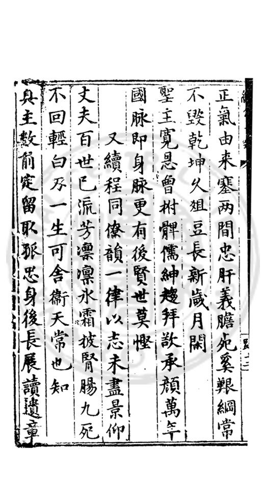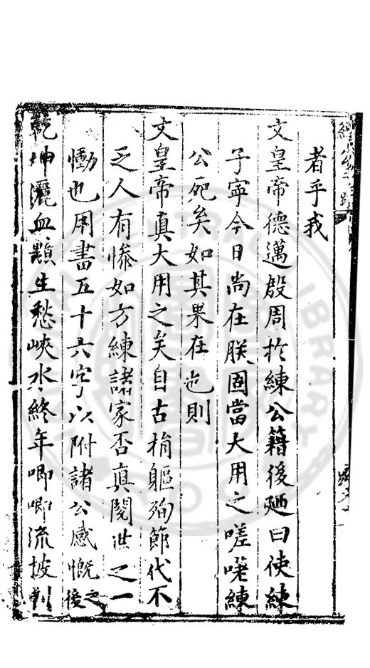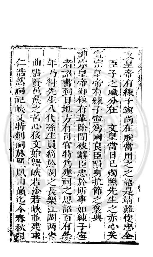 文皇帝於卓敬既死之猶惜之曰國家養士三十餘年不負其君者惟卓敬耳宣德二年遺官祭宋承相文天祥諭曰人臣之義當務盡忠此人心如鐵石百誘不屈可謂萬世不磨嘗揣想信國正氣之□衣帶之贊囚之者誰氏之獄殺之者誰氏之手覽者何不怒而擲之乃□而□之傳之且載之簡編夫□之傳之載之者何心亦曰夫夫也宋朝一死不忘君忠臣也云爾練先生誠王安在四字既觸□慘刑