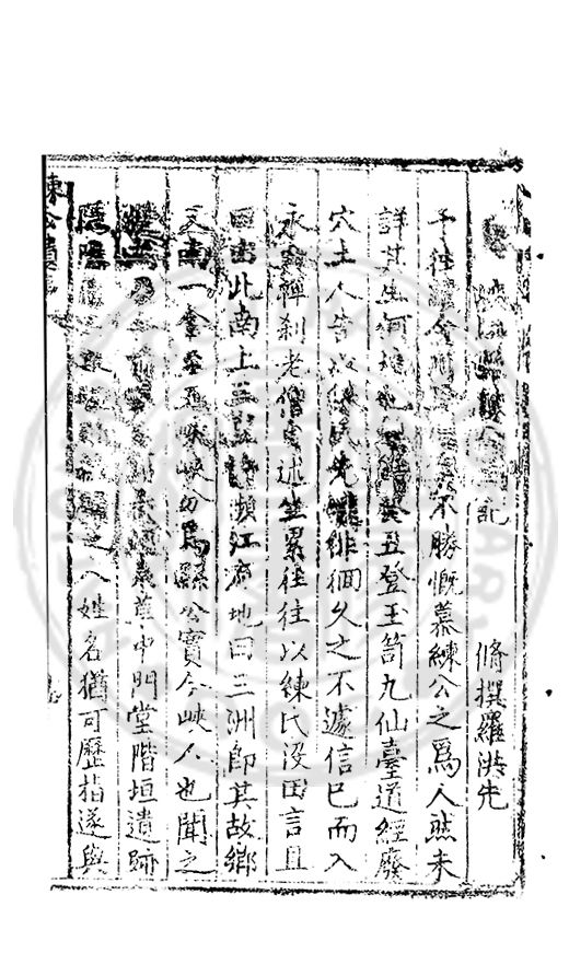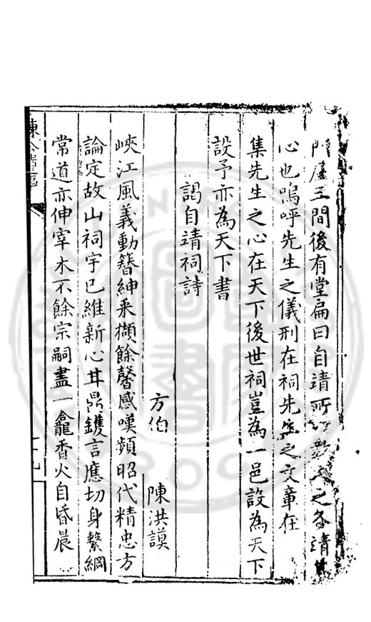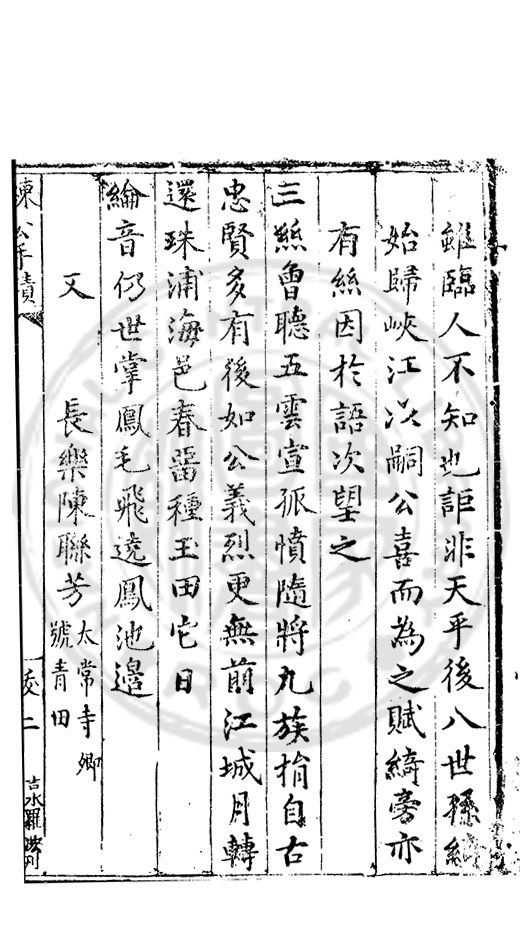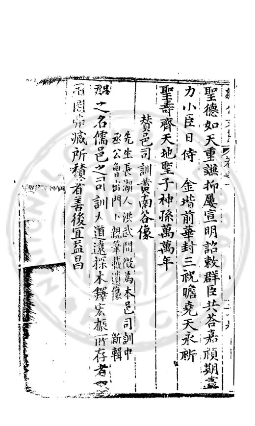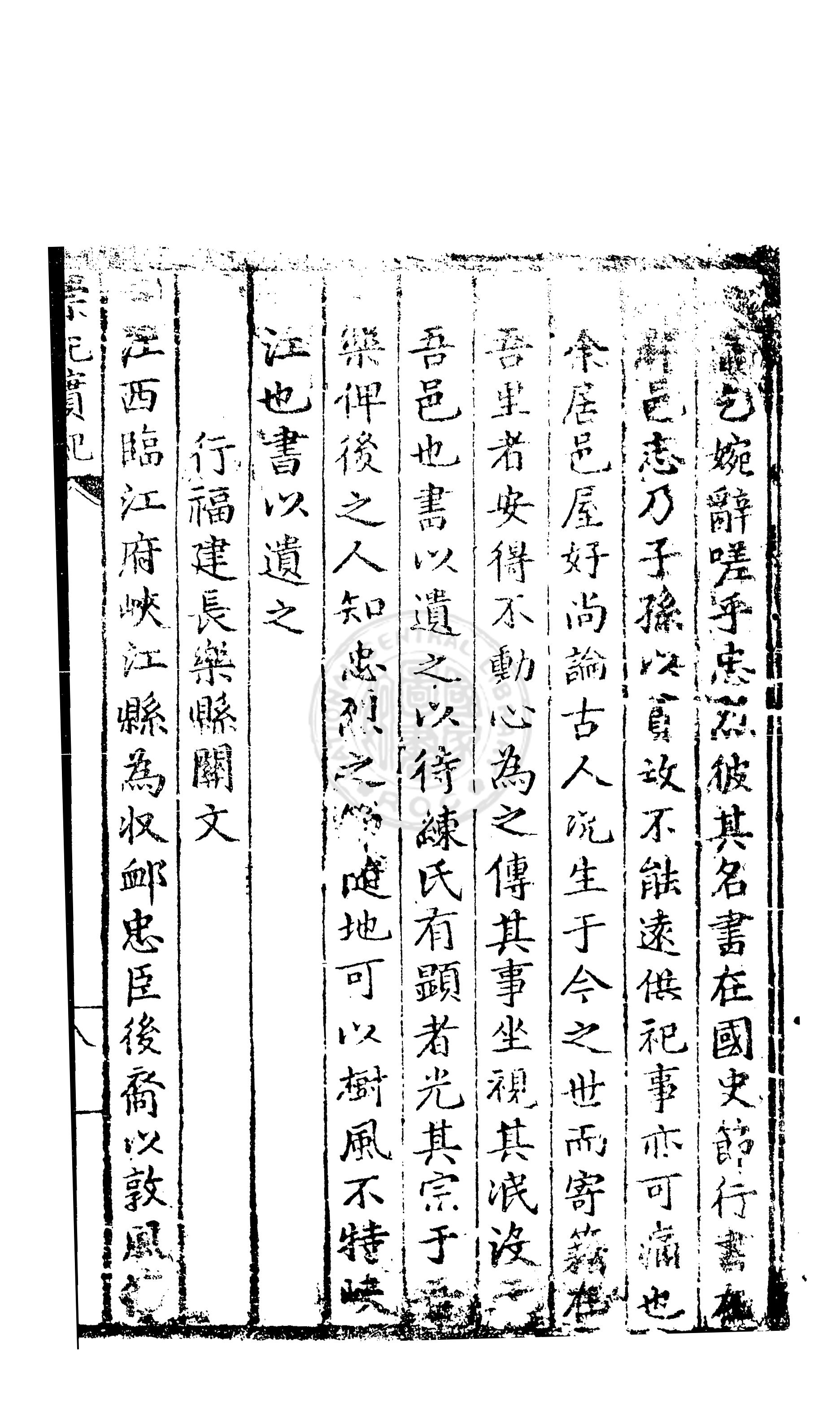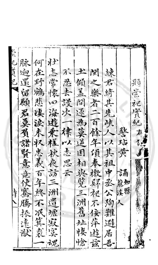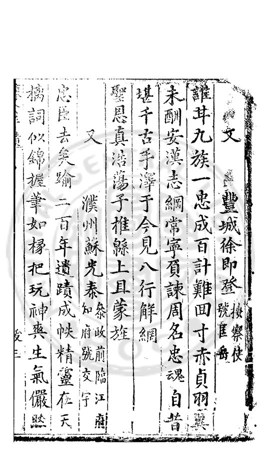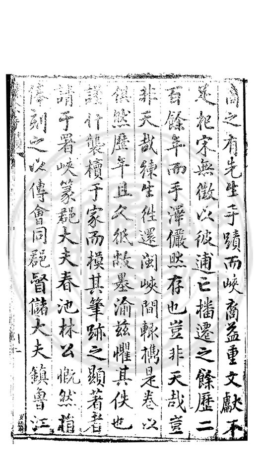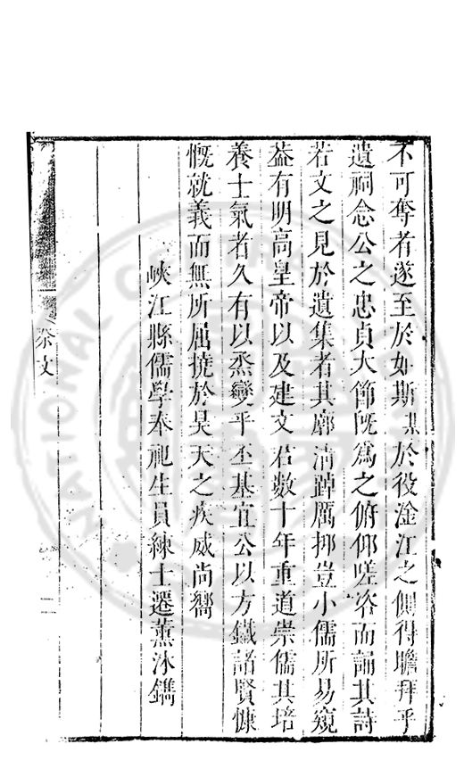 豈猶新凡啣命使者臨峽誰不辨□□登先生之堂兩項禮焉今九代孫生員士遷卓然自立雖處困約之中確守固窮之節□頓數□□田以養廉焉皆賢祖仁疾之遺惠也先達如羅如曾如陳如郭如徐彤□櫞筆連篇累牘洋洋灑灑表彰先生者可謂雲錦□燦句珠玉而字金石此余謂邀恩食報古今來忠臣義士亦未有如先生之□者也余愧剪陋不能從諸先達後賢先生一辭□於先輩序文中獨□青