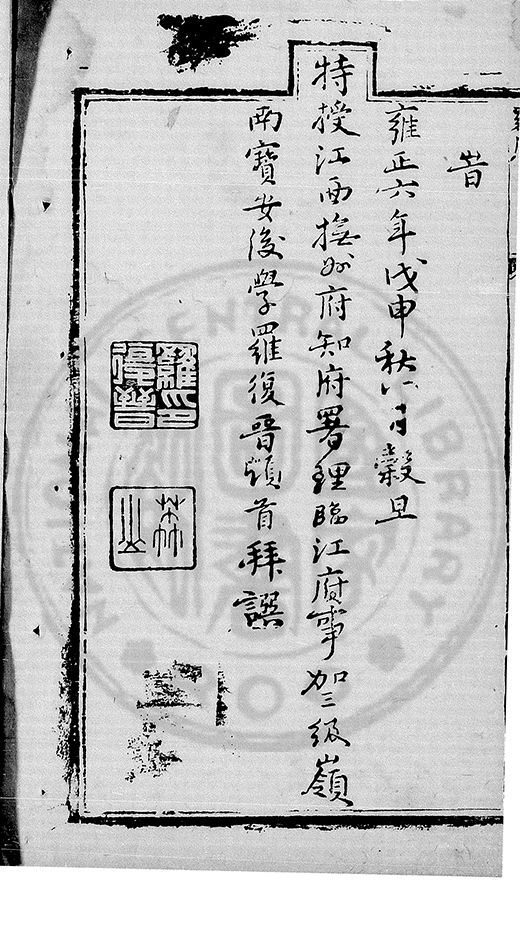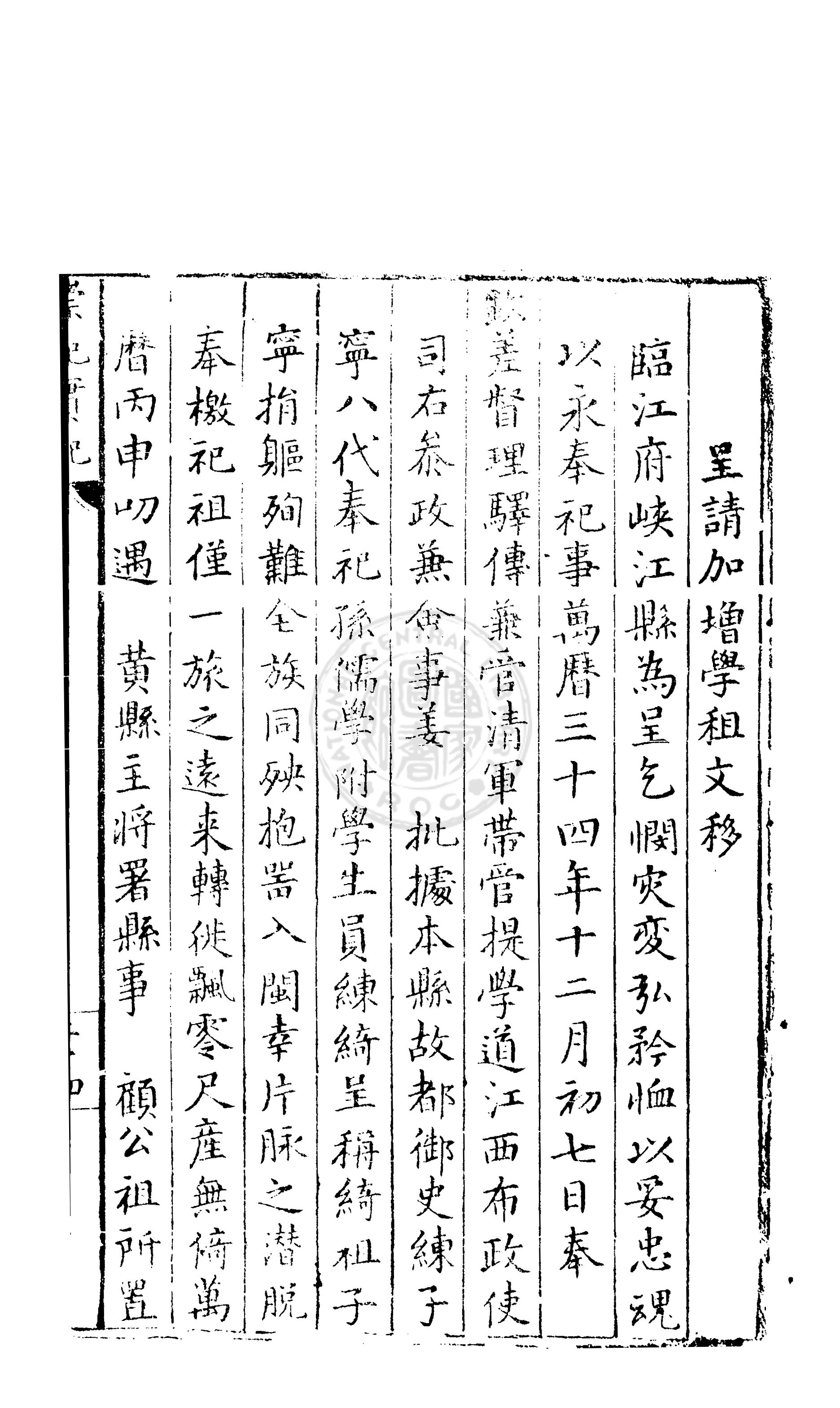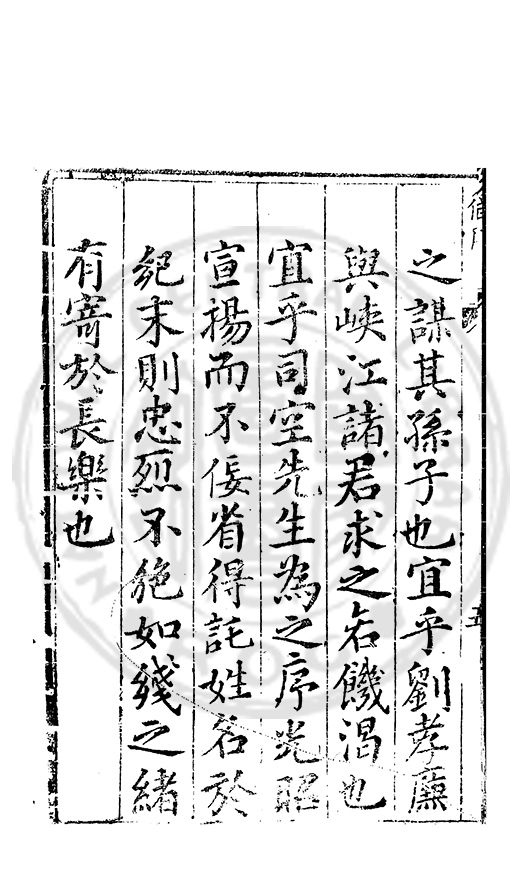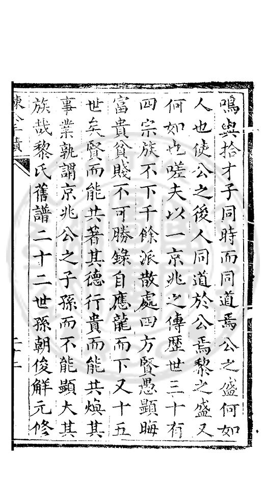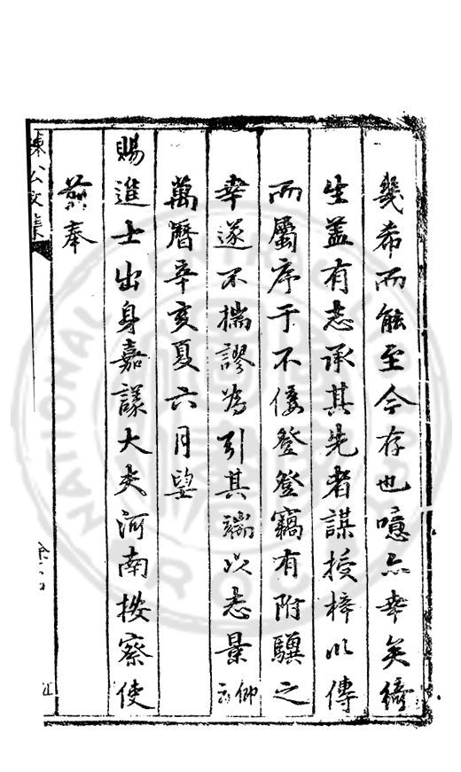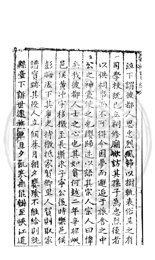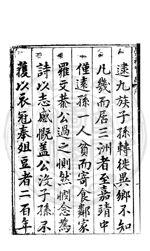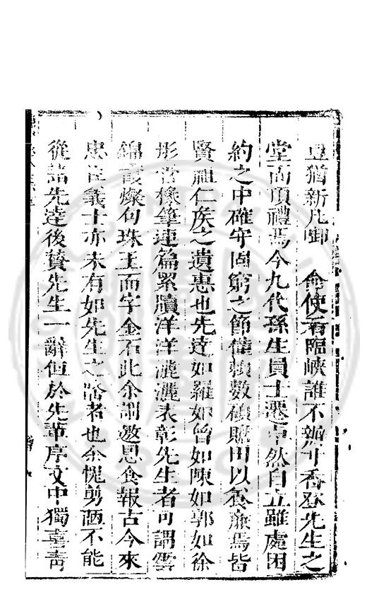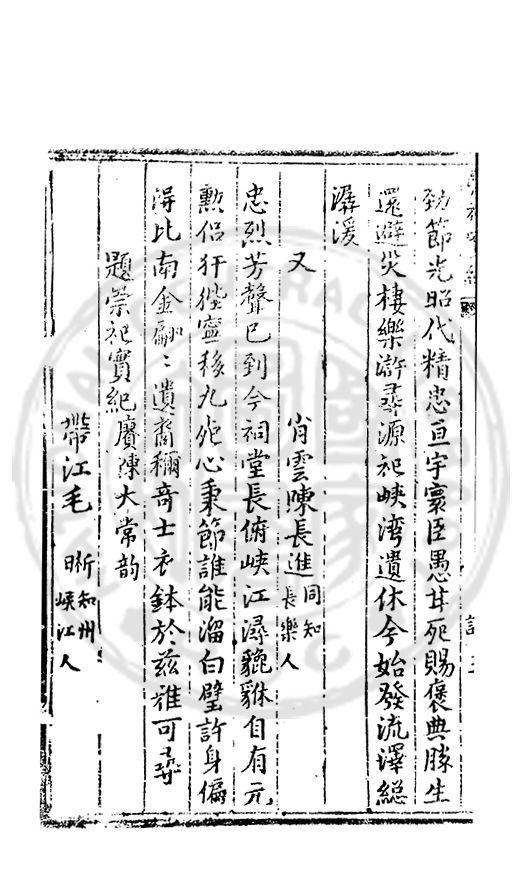 豈猶新凡啣命使者臨峽誰不辨□□登先生之堂兩項禮焉今九代孫生員士遷卓然自立雖處困約之中確守固窮之節□頓數□□田以養廉焉皆賢祖仁疾之遺惠也先達如羅如曾如陳如郭如徐彤□櫞筆連篇累牘洋洋灑灑表彰先生者可謂雲錦□燦句珠玉而字金石此余謂邀恩食報古今來忠臣義士亦未有如先生之□者也余愧剪陋不能從諸先達後賢先生一辭□於先輩序文中獨□青