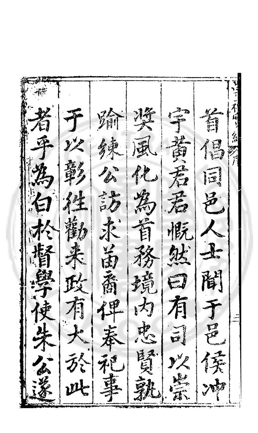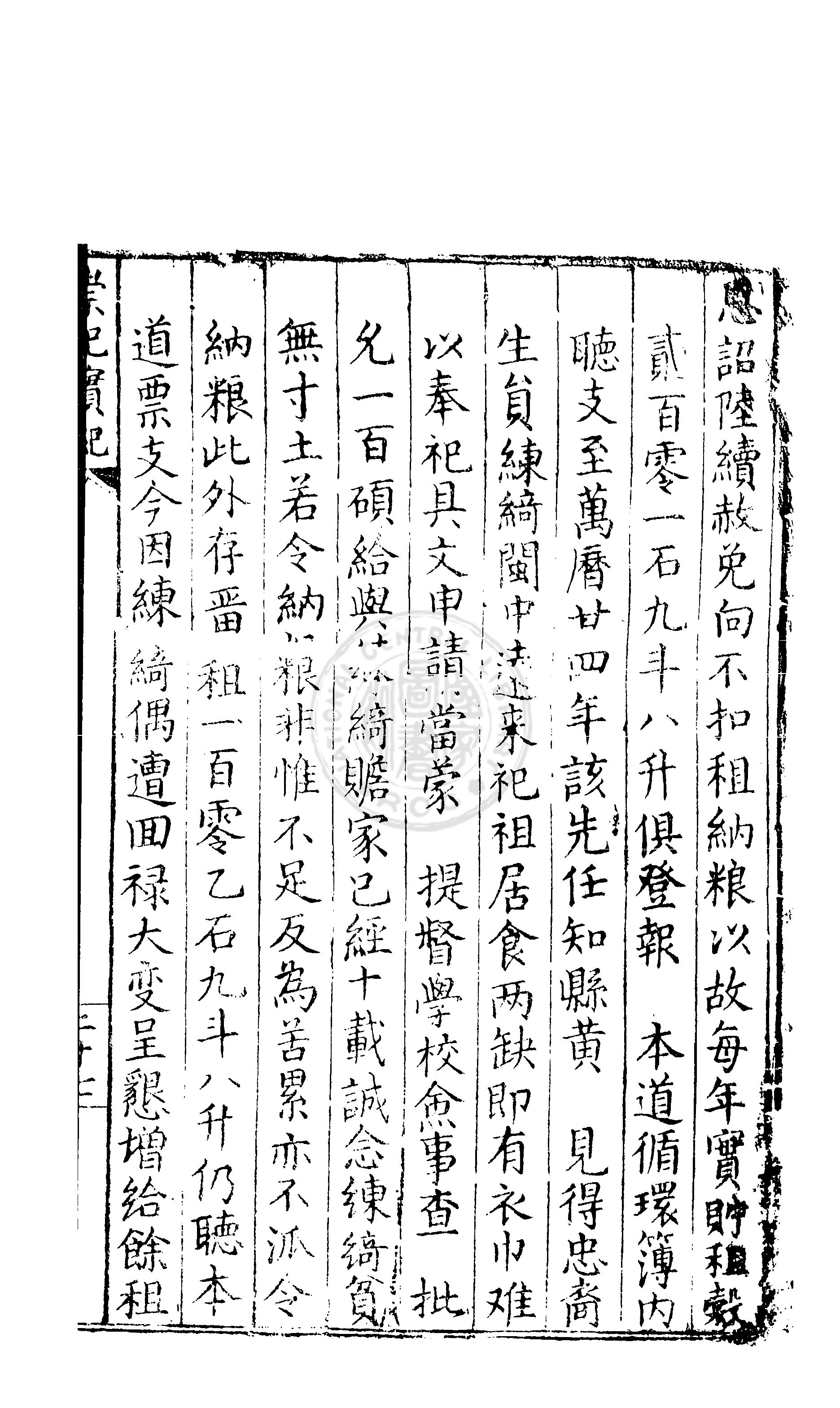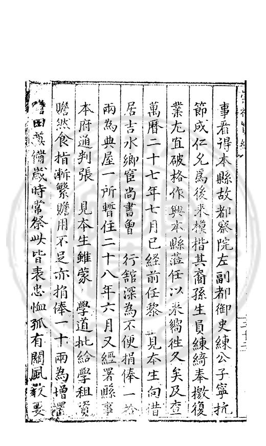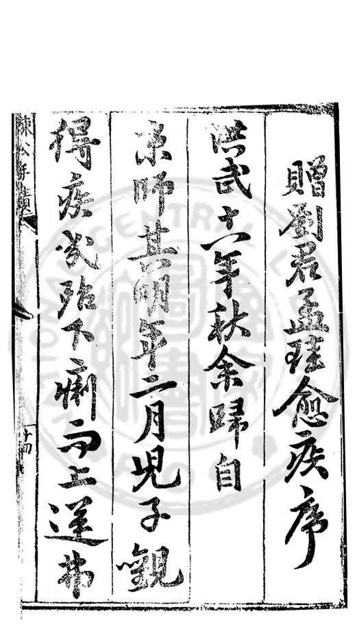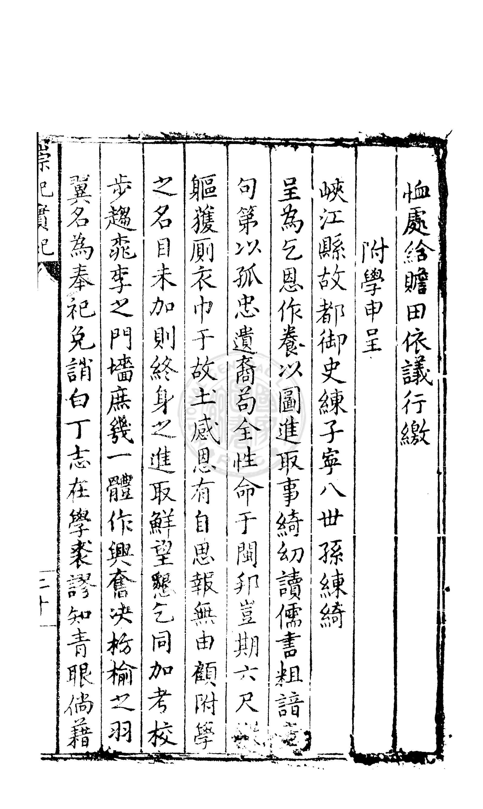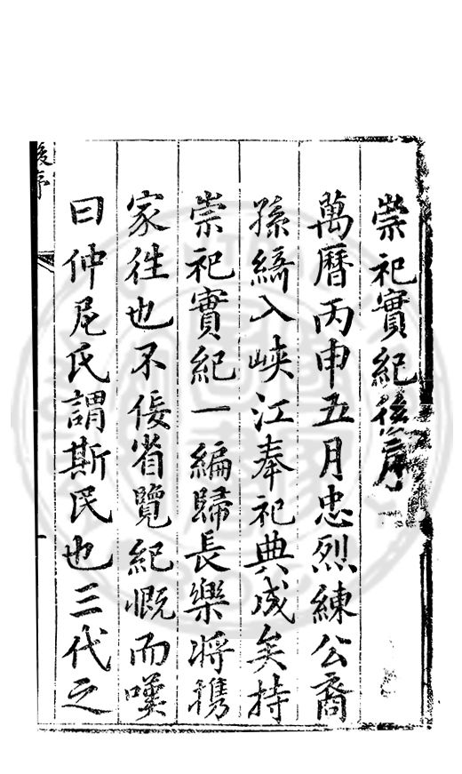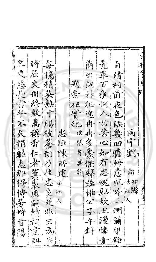 豈猶新凡啣命使者臨峽誰不辨□□登先生之堂兩項禮焉今九代孫生員士遷卓然自立雖處困約之中確守固窮之節□頓數□□田以養廉焉皆賢祖仁疾之遺惠也先達如羅如曾如陳如郭如徐彤□櫞筆連篇累牘洋洋灑灑表彰先生者可謂雲錦□燦句珠玉而字金石此余謂邀恩食報古今來忠臣義士亦未有如先生之□者也余愧剪陋不能從諸先達後賢先生一辭□於先輩序文中獨□青