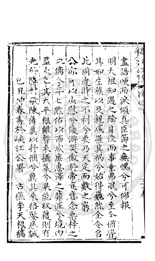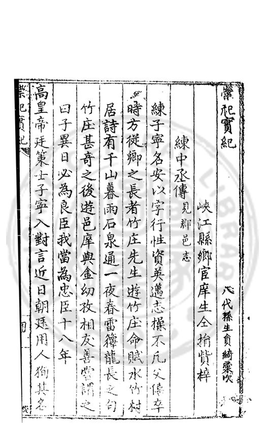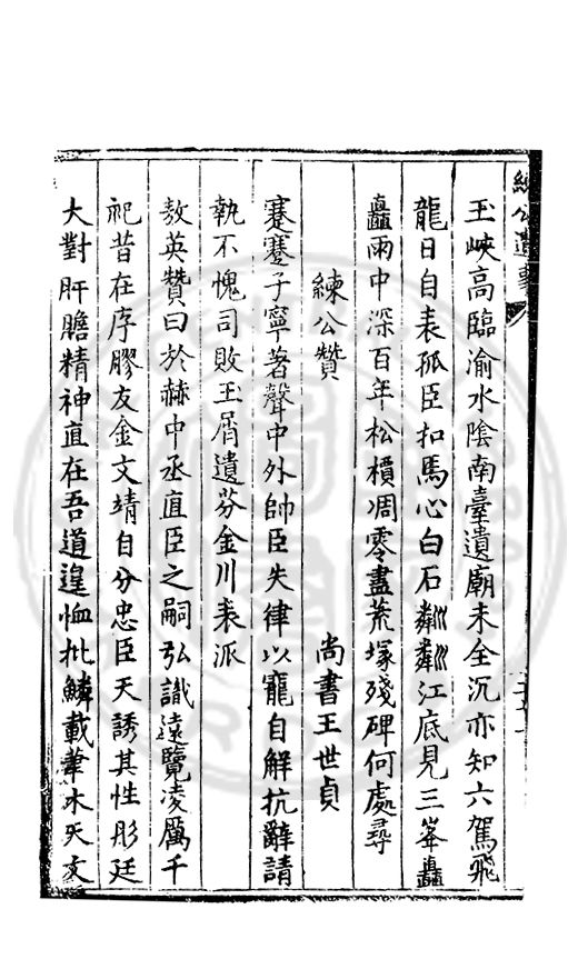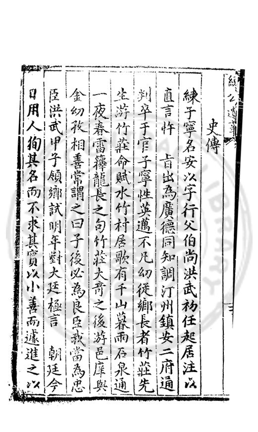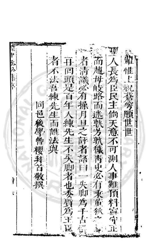 聖人長為臣民主倘天意不可測人事難預料寧守正而趨母歧路而迷孰芳孰穢青史必有秉董孤□□者清議必有操月旦之評者語曰一失腳為千古□再回頭是百年人練先生不失腳者也委質為王臣者不法吾練先生而誰法與