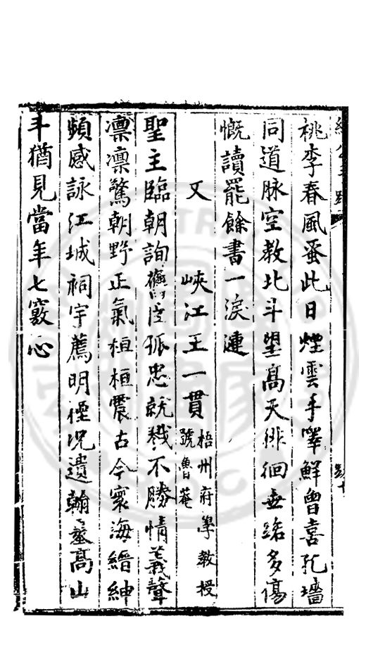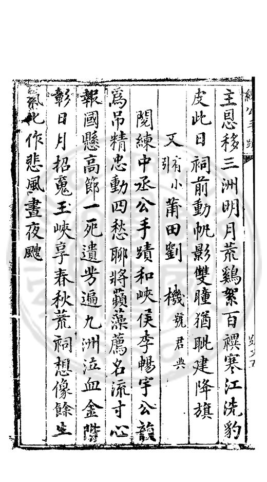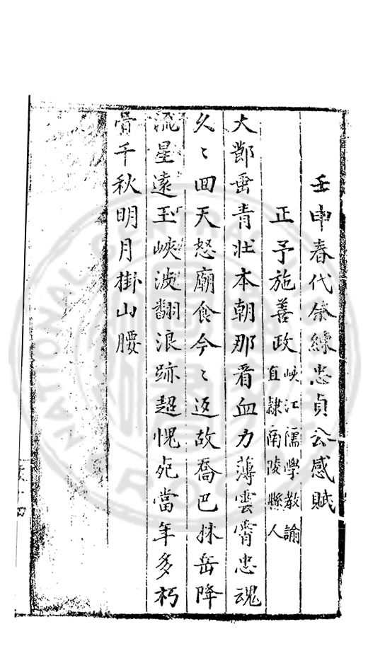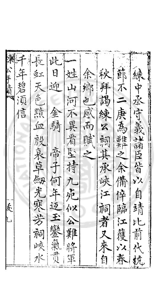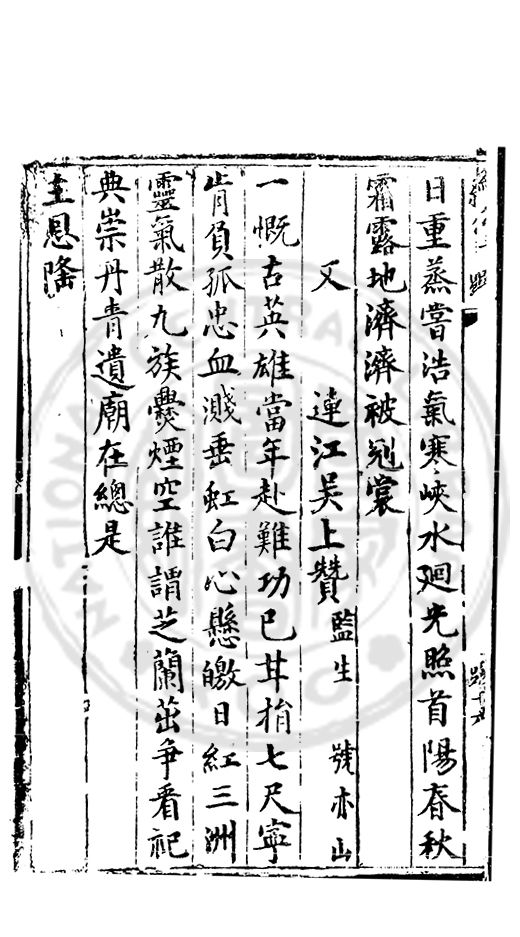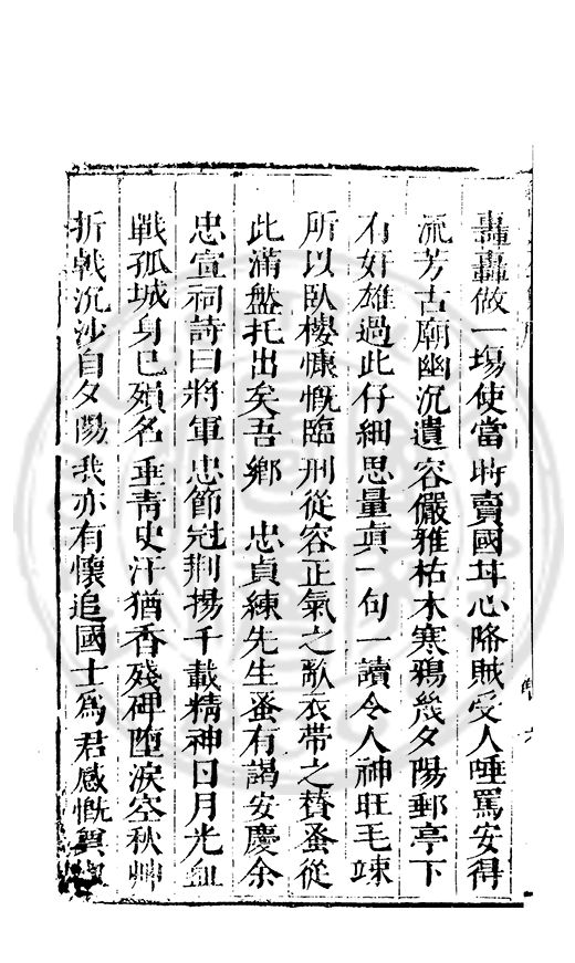 轟轟做一□使當時賣國□心降賊受人唾罵安得流芳古廟幽沉遺容儼雅枯木寒鴉幾夕陽郵亭下有奸雄過此仔細思量真一句一讀令人神旺毛竦所以臥樓慷慨臨刑從容正氣之□衣帶之贊蚤從此滿盤托出矣吾鄉忠貞練先生蚤有□安慶余忠宣祠詩曰將軍忠節冠荊揚千載精神曰月光血戰孤城身巳殞名垂青史汗猶香殘碑墮淚空秋□折戟沉沙自夕陽我亦有懷追國士為君感慨□□
