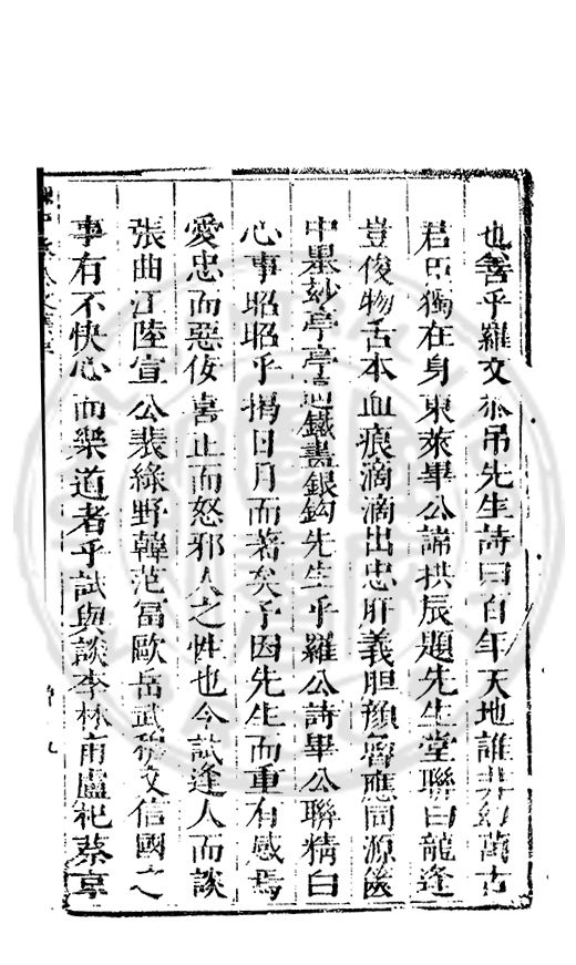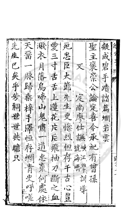 也善乎羅文□吊先生詩曰百年天地誰□幻萬古君臣獨在身東萊畢公□拱辰題先生堂聯曰龍逢俊物舌本血痕滴滴出忠肝義膽顏魯應同源□中墨□亭亭□鐵畫銀鉤先生乎羅公詩畢公聯精白心中昭昭乎揭日月而怒邪人之性也今試逢人而□張曲江陸宣公裴綠野范富歐岳武□文信國之事有不快心而樂道者乎試與談李林甫盧杞□□