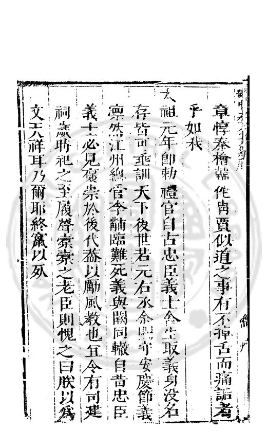 太祖元年即敕禮官自古忠臣義士舍生取義身沒名存皆可垂訓天下後世若元右丞余□守安慶節義凜然江州總管李□臨難死義與闕同轍自昔忠臣義士必見褒崇於後代蓋以勵風教也宜令有司建祠歲時祀之至履聲□□之老臣則愧之曰朕以為文天祥耳乃耶終竄以死
