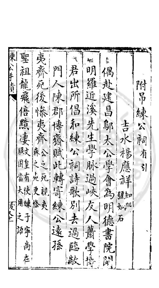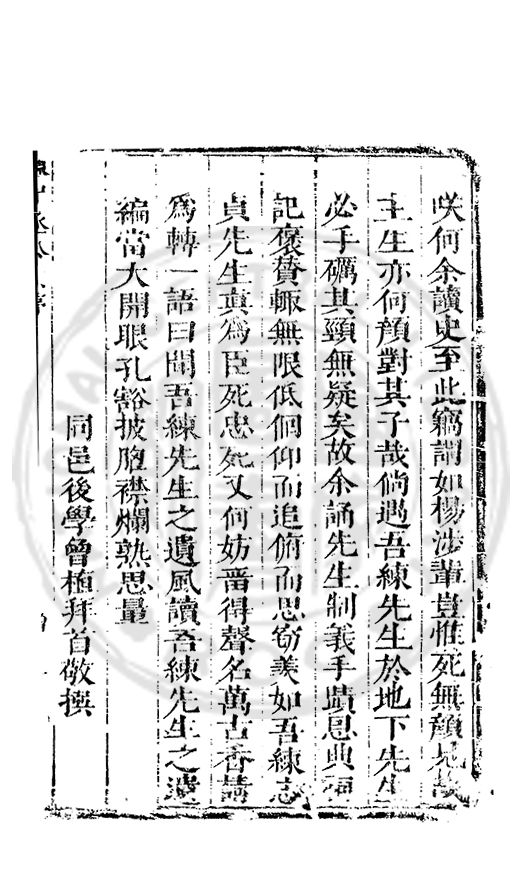 咲何余讀史至此竊謂如楊涉輩豈惟死無顏見哉主生亦何顏對其子哉倘遇吾練先生於地下先生必手礪其頸無疑矣故余誦先生制義手蹟恩典祠記褒贊輙無限低□仰而追俯而恩窃羨如吾練忠貞先生真為臣死忠死又何妨□得聲名萬古香請為轉一語曰聞吾練先生之遺風讀吾練先生之遺編當大開眼孔豁披胸襟爛熟思量
