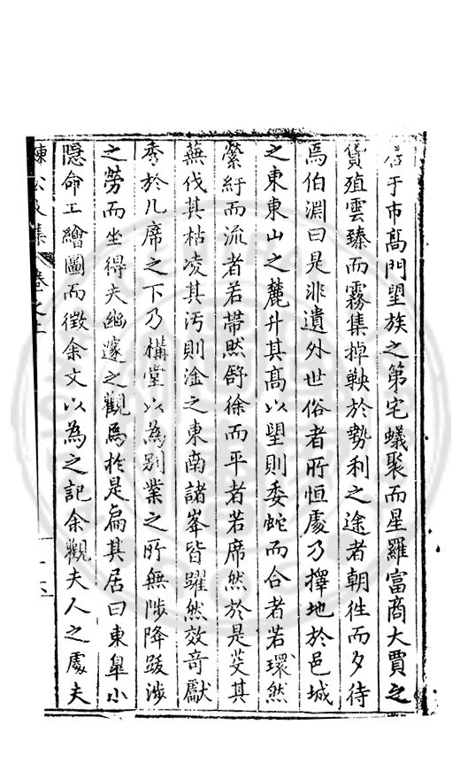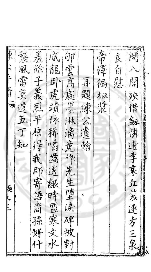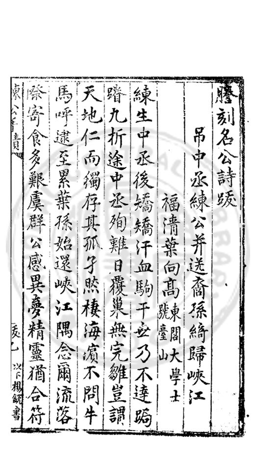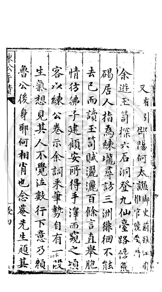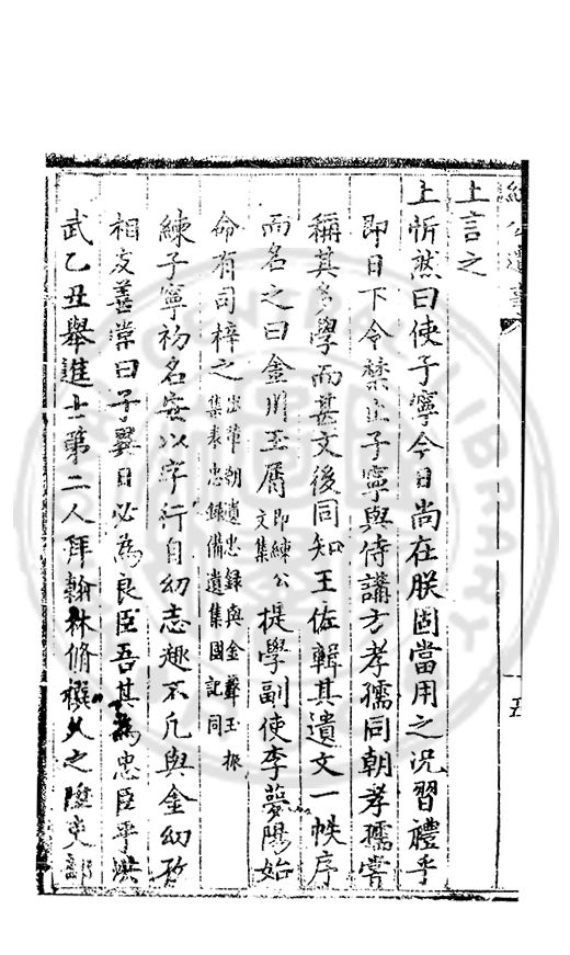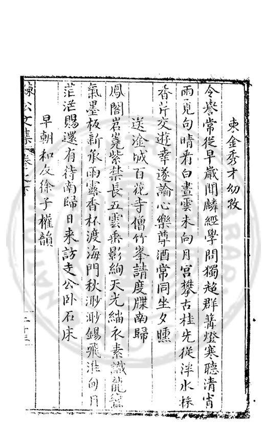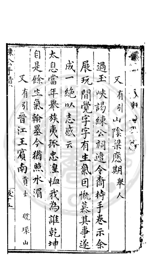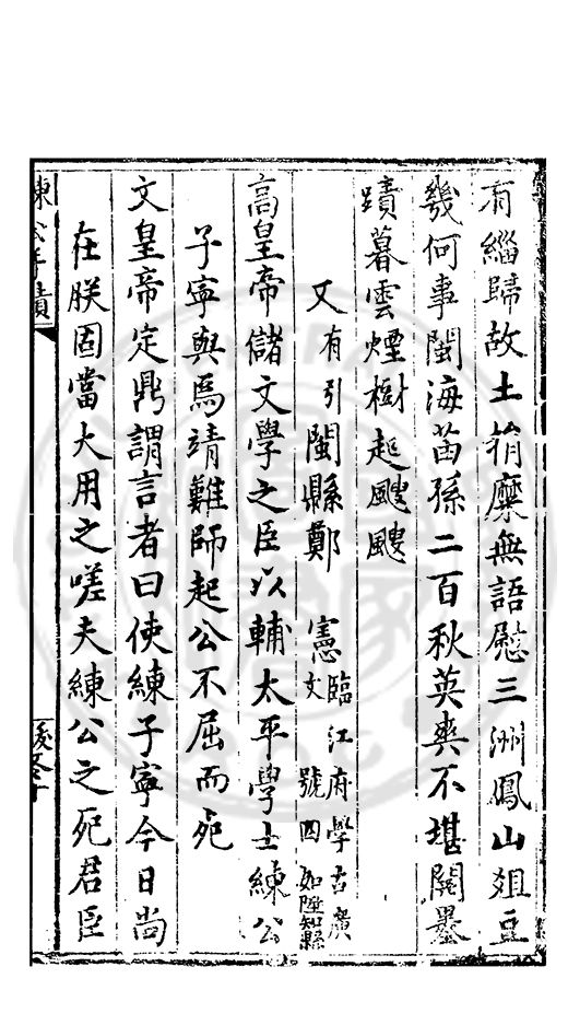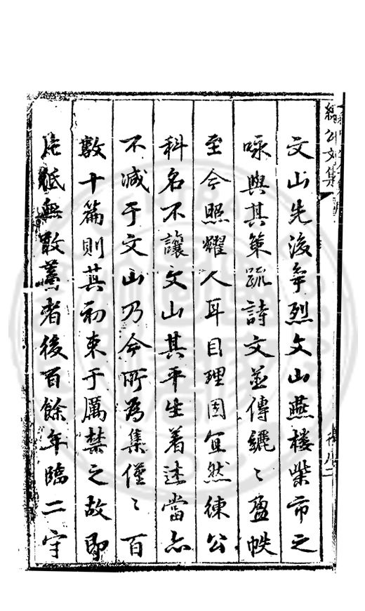 文山先浚爭烈文山燕樓□市之□與其策詩文並傳□□盈□至今照耀人耳目理因□然練公科名不讓文山其平生看述當□不減于文山乃金所為集□□百數十篇則其初束于厲禁之故即片□無散數看者後百餘年臨二守