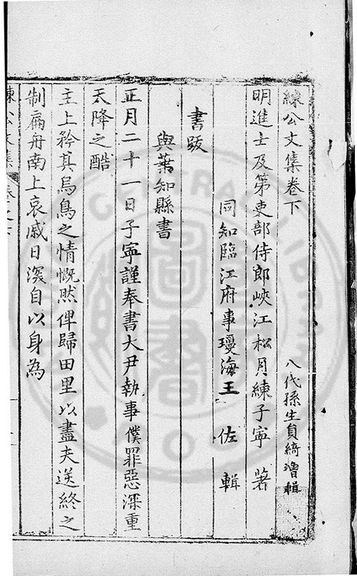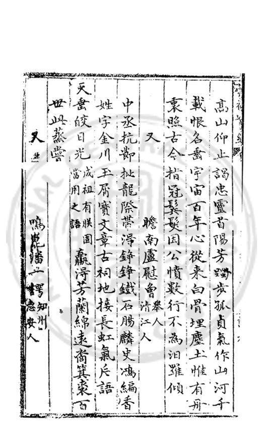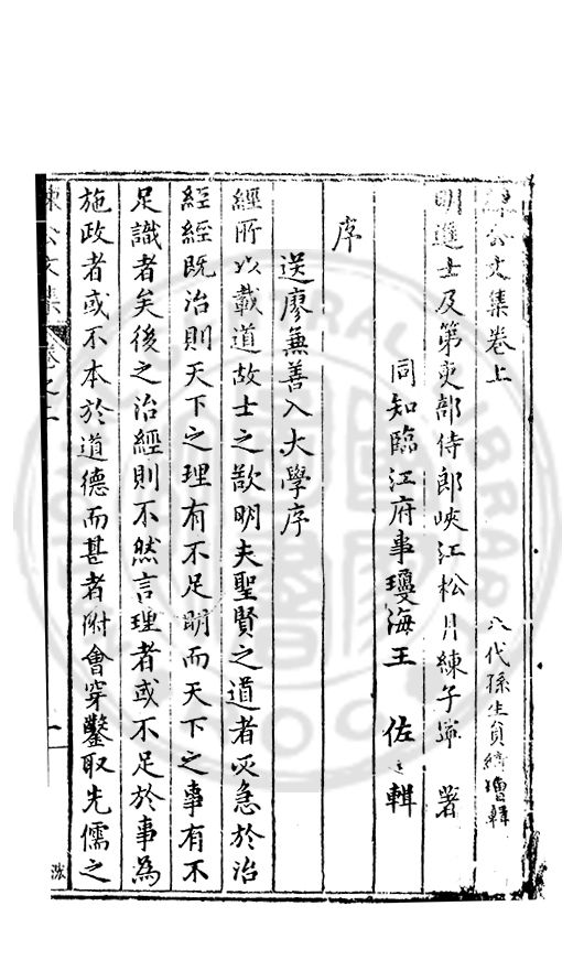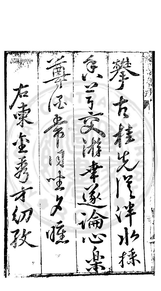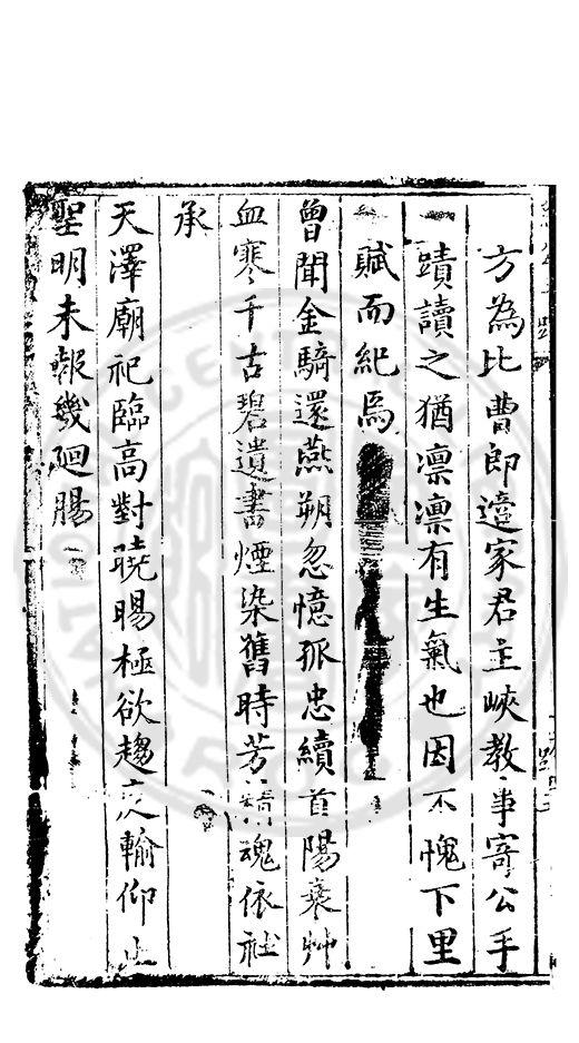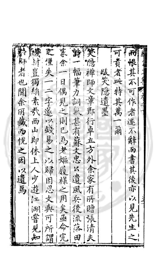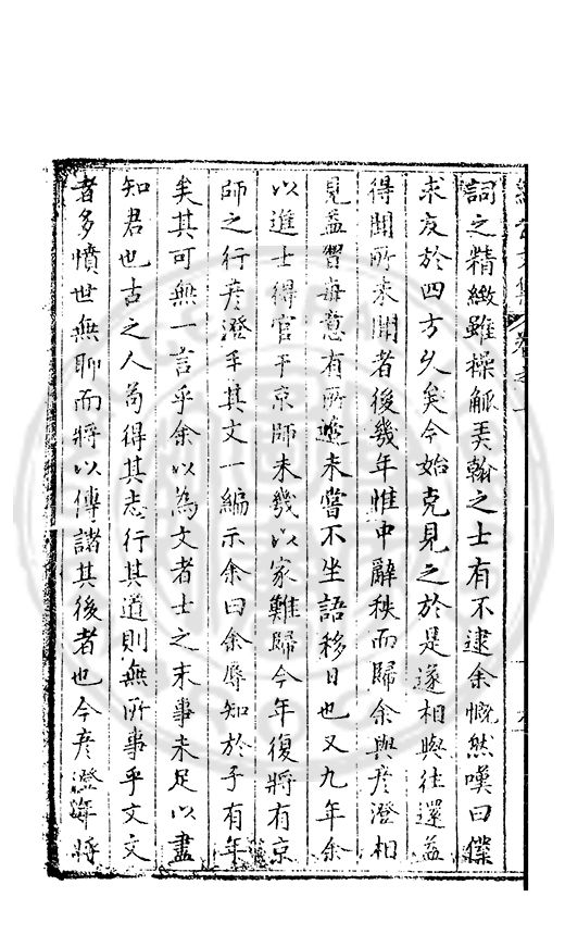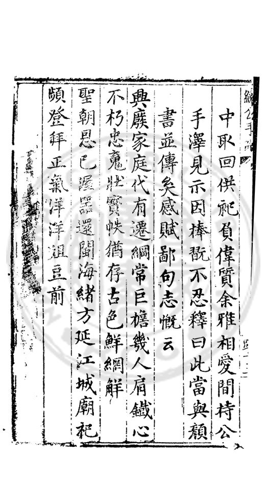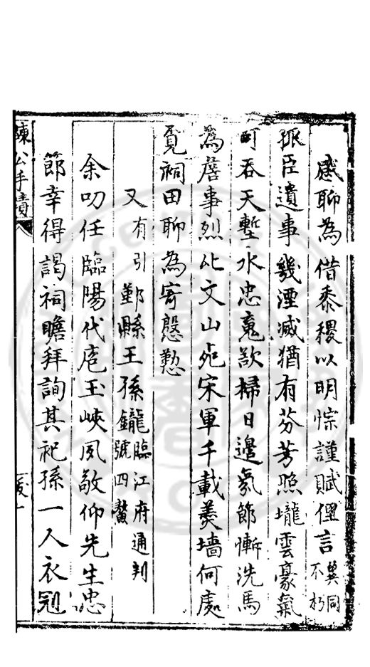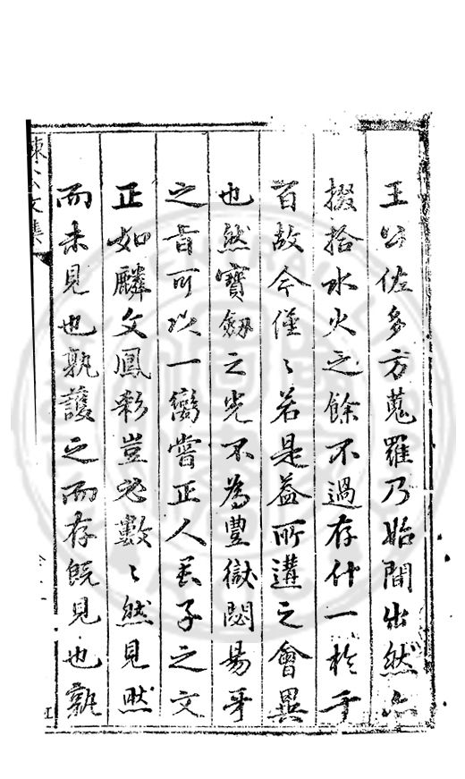 王公佐多方蒐羅乃始間出然□掇拾水火之餘不過存什一於于百故今僅僅若是益所遘之會異也然寶劍之光不為豐獄閟易牙之旨可以一鬻嘗正人君子之文正如麟文鳳彩豈光數數然見然而未見也孰護之而存既見也孰