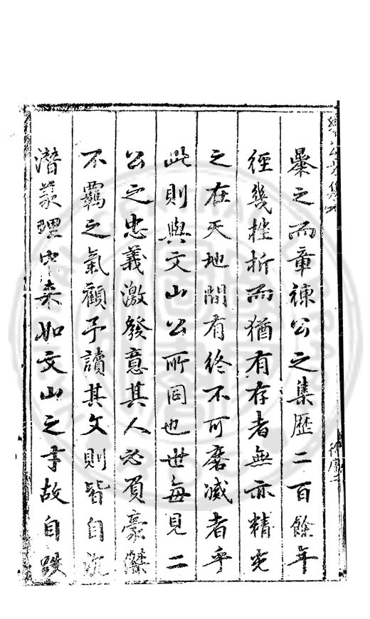 □之而章練公之集歷二百餘年徑幾挫折而猶有存者無亦精光之在天地間有終不可磨滅者乎此則與文山公所同也世每見二公之忠義激發意其人必負豪傑不覊之氣顧予讀其文則皆自次潛□理中來如文山之□故自跌