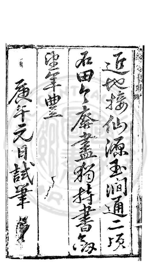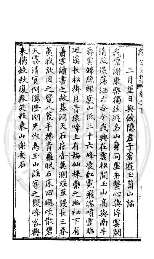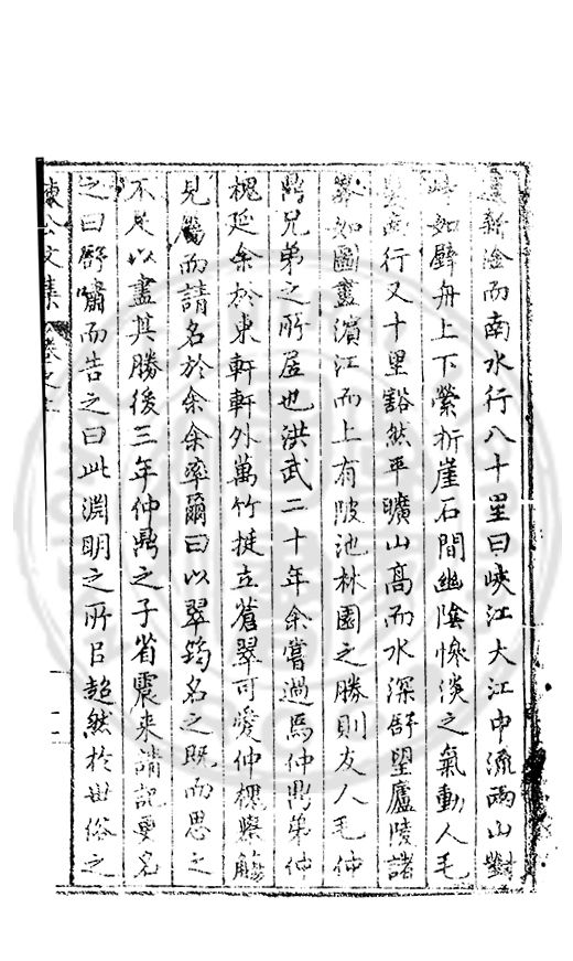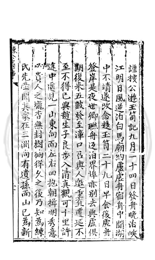 謹□公遊玉筍記九月二十四日發舟晚泊峽江明日風逆泊白馬廟約廬□舟宿舟中聞湖中不靖遂改念□玉筍二十九日早食後□舟登岸是夜世卿聯舟□泊界埠亦別去與盧俱期復來五□發至潼口召輿人邀重直遷延不至不得已與趙生子良步入清真觀可十里許途中遙見一山東向左右回抱朝楫明秀意必貴人之壠杳無封樹倘佯乆之後乃知為練氏先□□其家在三聞尚有遺孫而山巳為新