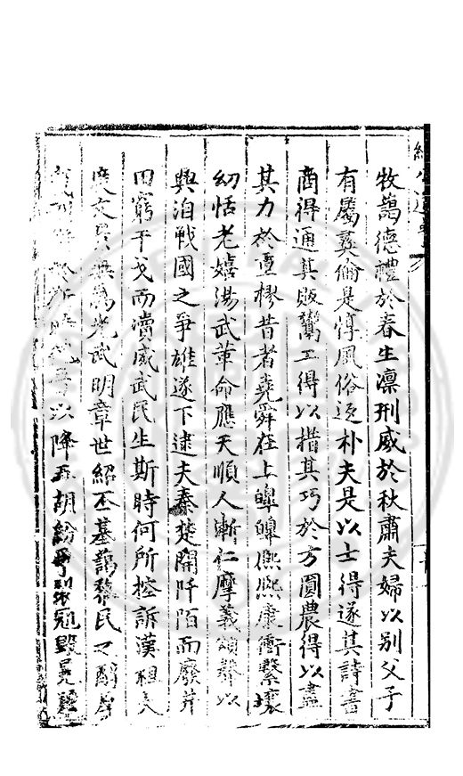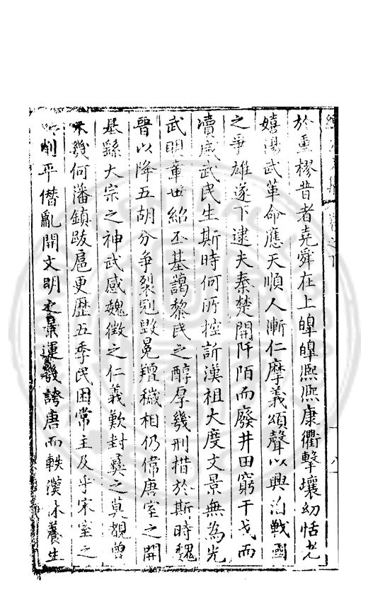 牧藹德禮於春生凜威刑於秋肅夫婦以別父子以屬彝倫是惇風俗返樸夫是以士得遂其詩書商得通其販鬻工得以措其巧於方圓農得以盡其力於穜稑昔者堯舜在上皥皥熙熙康衢擊壤幼恬老嬉湯武革命應天順人漸仁摩義頌聲以興洎戰國之爭雄遂下逮夫秦楚開阡陌而廢井田窮干戈而瀆威武民生斯時何所控訴漢祖大度文景無為光武明章世紹丕基藹黎民之醇厚幾刑措於斯時魏晉以降五胡紛爭裂冠毀冕羶