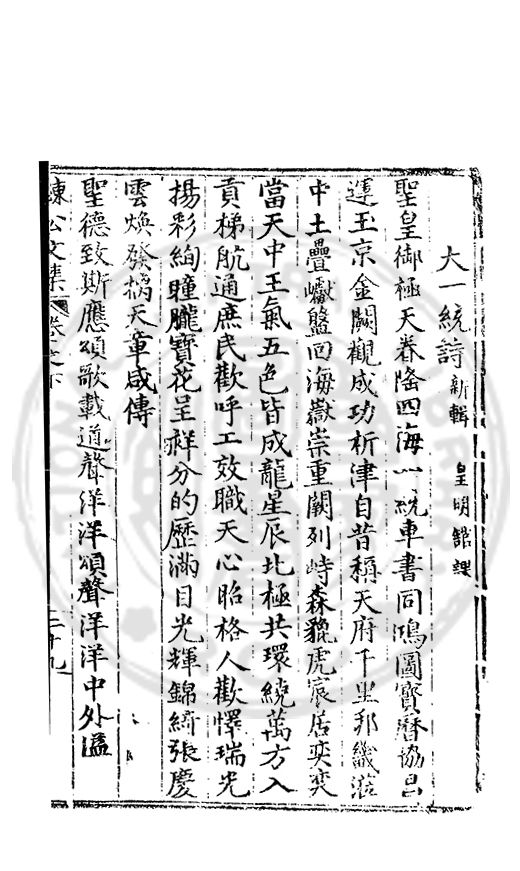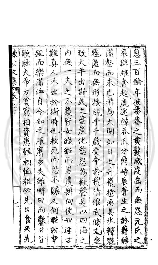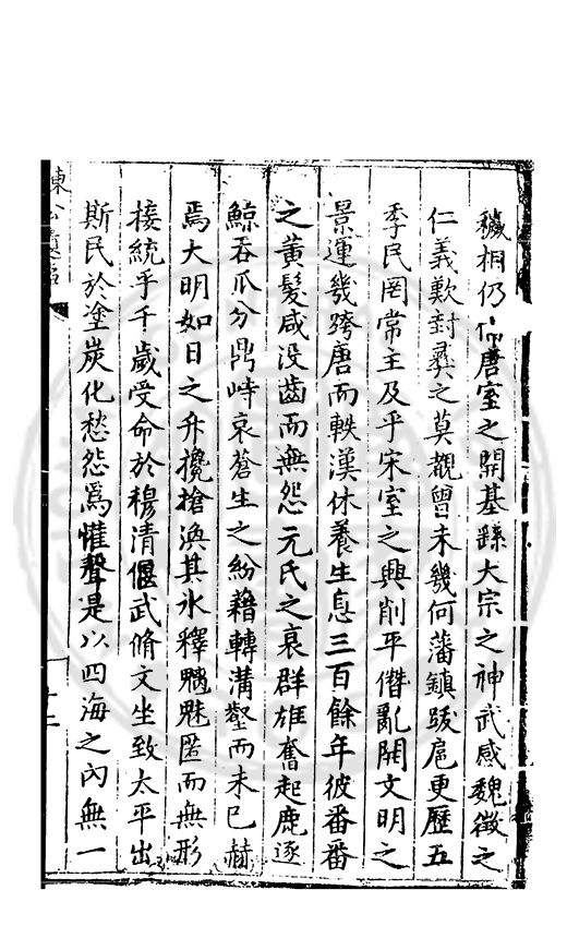 穢相仍偉唐室之開基繇太宗之神武感魏徵之仁義歎封彝之莫覩曾未幾何藩鎮跋扈更歷五季民無常主及乎宋室之興削平僣亂開文明之景運幾跨唐而軼漢休養生息三百餘年彼番番之黃髮咸沒齒而無怨元氏之衰羣雄奮起鹿逐鯨吞瓜分鼎峙哀蒼生之紛籍轉溝壑而未已赫焉大明如日之升攙搶渙其冰釋魑魅匿而無形接統乎千歲受命於穆清偃武脩文生致太平出斯民於塗炭化愁怨為歡聲是以四海之內無一