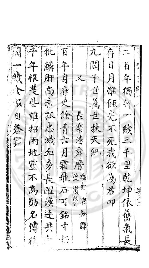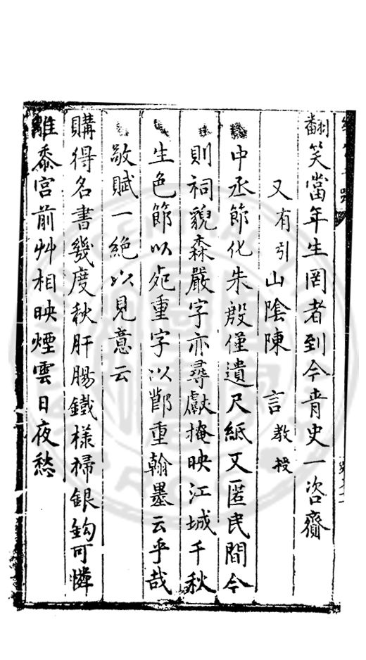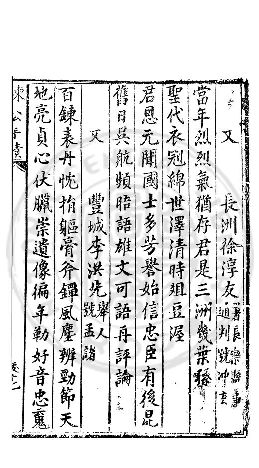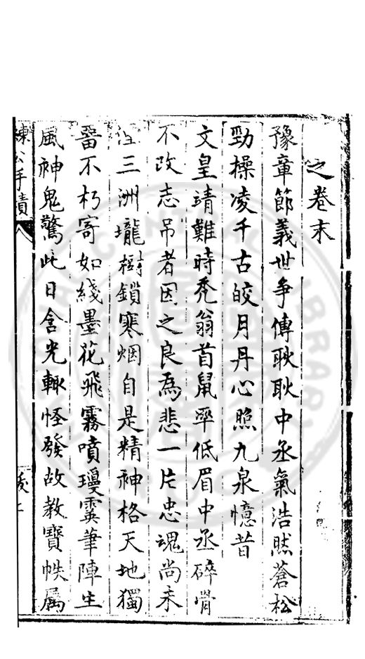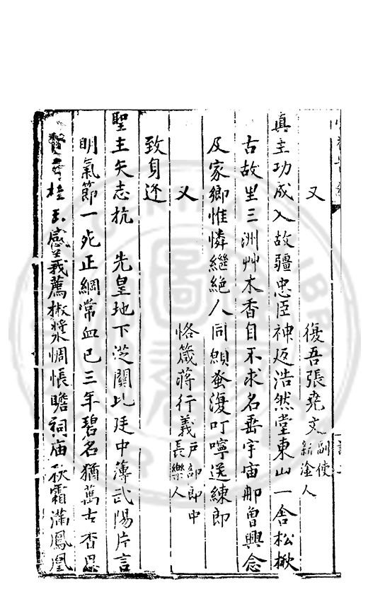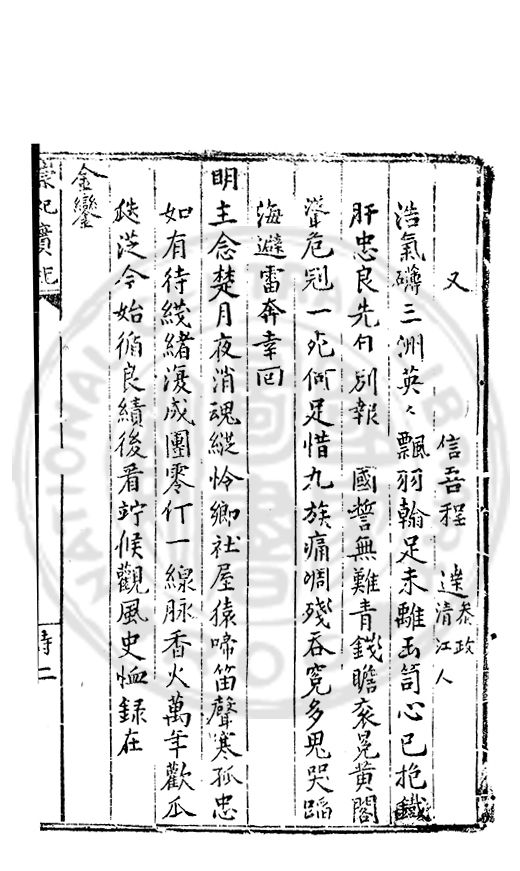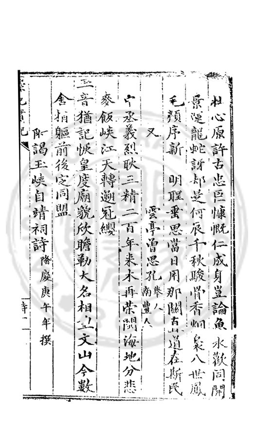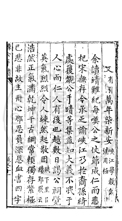 溫陵李卓吾先生豪邁奇人無書不纂無纂不評余最愛其史綱評要冷冷□刺趣絕千古而獨未載文信國題張許雙廟辭何也其辭句嚴字肅可以壯丈夫之骨可以寒壬人之膽其辭曰為臣死忠為子死者死又何妨自光岳氣分士無全節君臣義缺誰負剛腸罵賊□陽愛君許遠晉得聲名萬古香後來者無二公之操百鍊之剛嗟哉人生歙□云亡好烈二