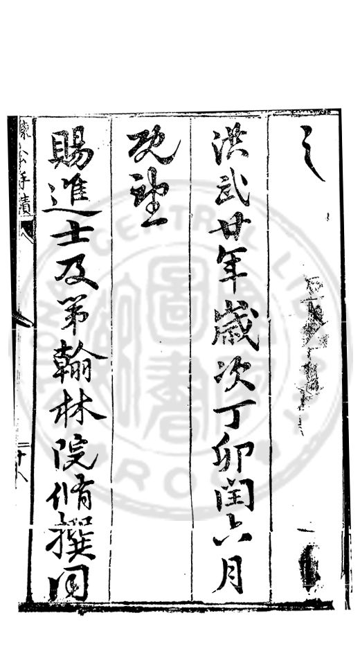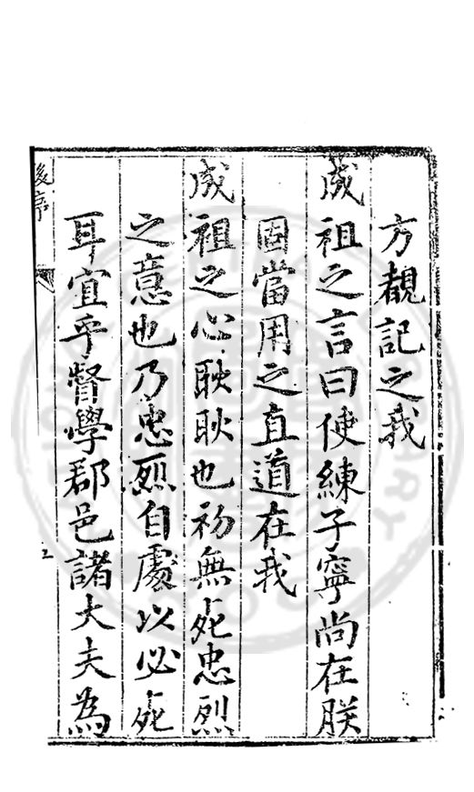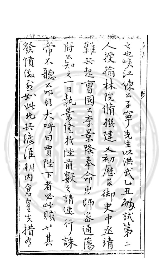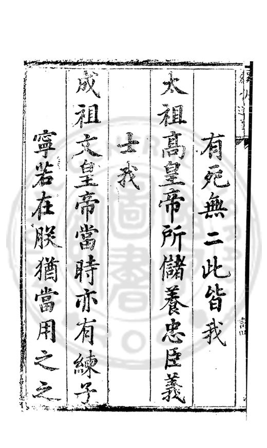 文皇帝則天□嫡派骨血至親似與二姓相征者不同迺先生獨與方黃耿卓諸公一齊確見火大內□□素所事也入金川門者吾未嘗事也□所事□為忠悖吾所事者為逆斷斷乎不事二君之義死節死