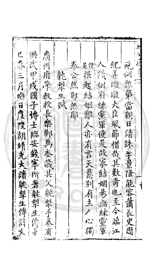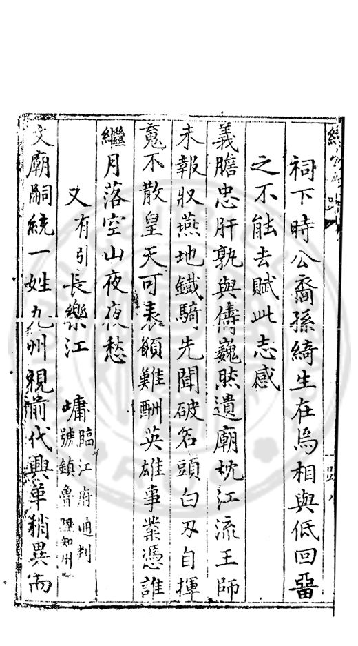 死何難第當朝日請誅李景£能容蕭長史周紀善皦皦大臣風節惜哉其數奇也至今臨江人議姻有練黨軍便是故家結姻易無練黨軍便是掘起結姻難人亦有言天意別有主人心獨奉公然耶然耶