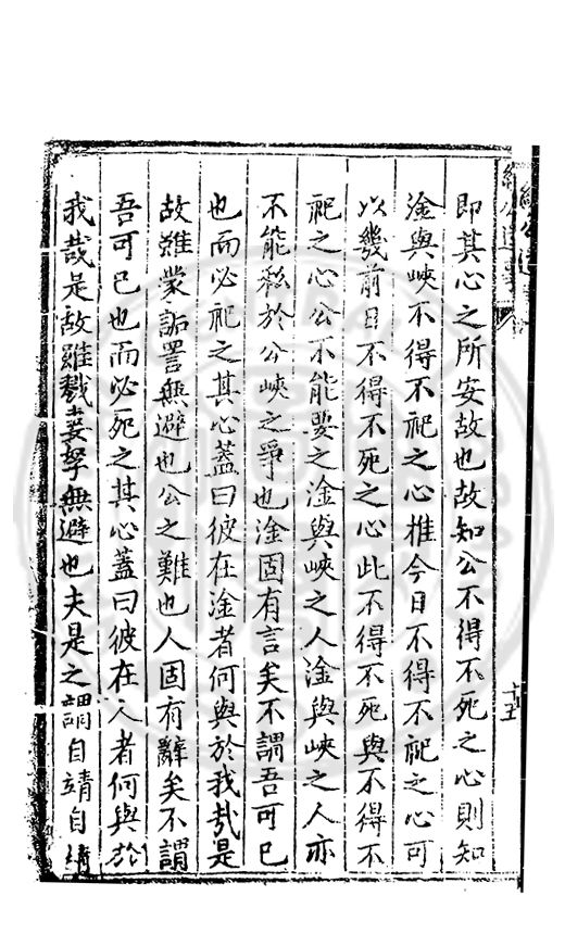即其心之所安故也故知公不得不死之心則知淦與峽不得不祀之心推今日不得不祀之心可以幾前日不得不死之心此不得不死與不得不祀之心公不能要之淦與峽之人淦與峽之人亦不能私於公峽之爭也淦固有言矣不謂吾可巳也而必祀之其心葢曰彼在淦者何與於我哉是故雖蒙詬詈無避也公之難也人固有辭矣不謂吾可巳也而必死之其心葢曰彼在人者何與於我哉是故雖戮妻孥無避也夫是謂之自靖自靖