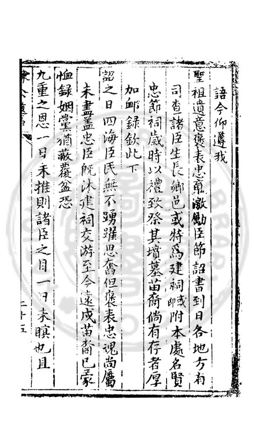 聖祖遺意褒表忠魂激勵臣節詔書到日各地方有司官查諸臣生長鄉邑或特為建祠或即附本處名賢忠節祠歲時以禮致祭其墳墓苗裔儻有存者厚加䘏録欽此下