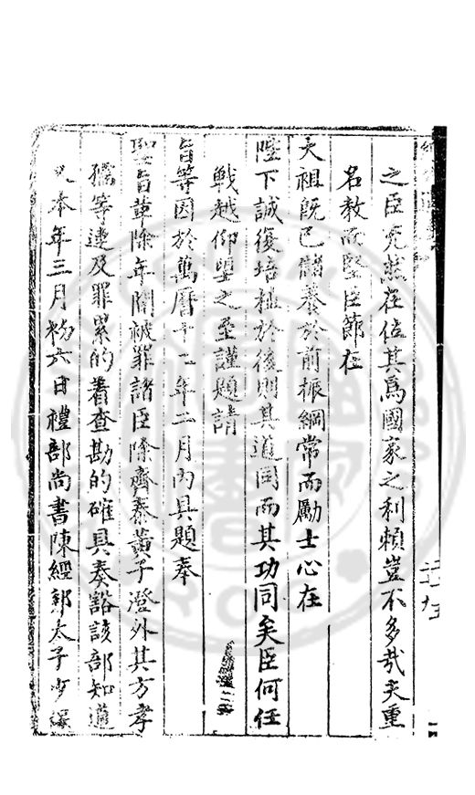 聖旨輩除年間□罪諸臣除齊□黃子澄外其方孝孺等連及罪累的看查勘的確具奏豁該部知道又本年三月初六日禮部尚書陳經□太子少□