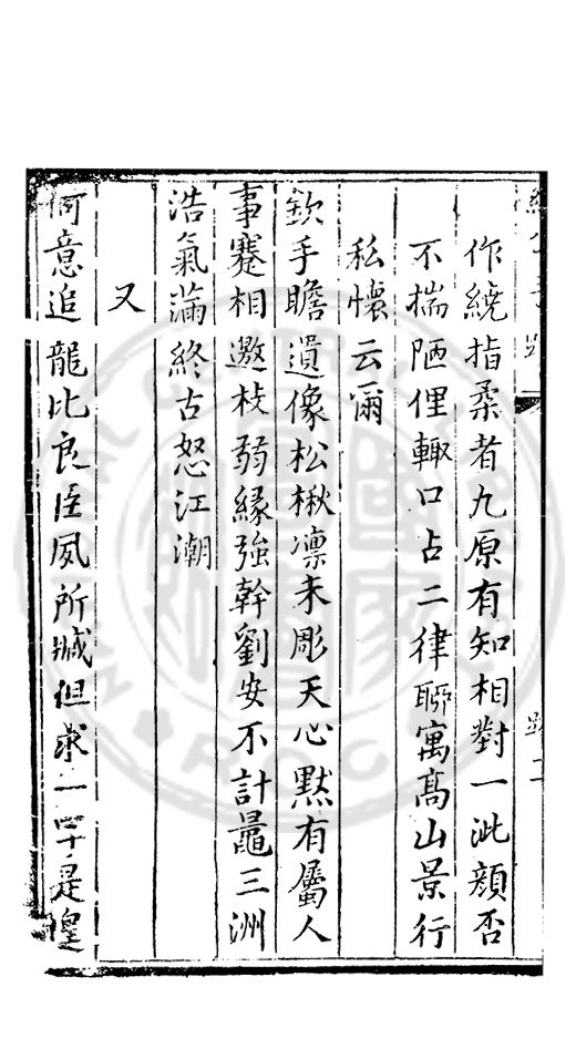 玉峽髙臨渝水隂南臺遺廟未全沈亦知六駕飛龍日自表孤臣扣馬心白石粼粼江底見三峯矗矗雨中深百年松檟凋零盡荒塚殘碑何處尋