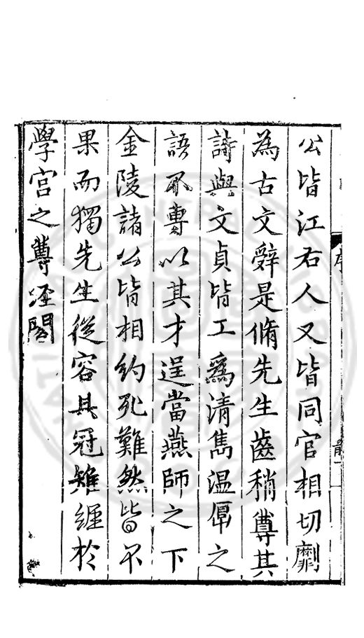 公皆江右人又皆同官相切劘為古文辤是脩先生齒稍尊其詩與文貞皆工為清雋溫厚之語不專以其才逞當燕師之下金陵諸公皆相約死難然皆不果而獨先生從容具冠雉經扵學宮之尊經閣